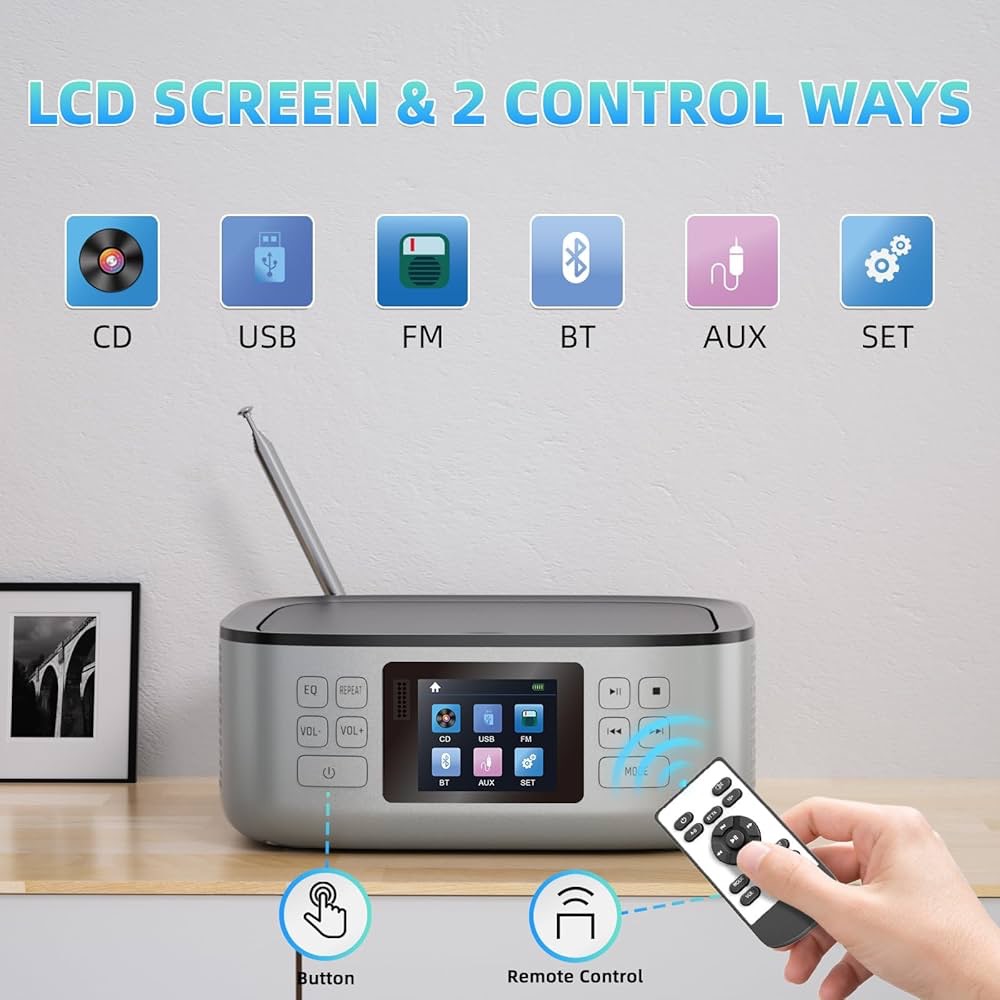 پخشکننده سیدی رومیزی کوچک: پخشکننده سیدی قابل حمل Boombox پنج حالت پخش (CD/USB/FM/Bluetooth/AUX) را نمایش میدهد. صفحه نمایش LED به شما امکان میدهد تا با دستگاه پخش سیدی کوچک، بصریتر کار کنید. همچنین میتوانید دستگاه پخش سیدی خانگی را با استفاده از دکمه روی دستگاه پخش سیدی کوچک یا کنترل از راه دور موجود، کنترل کنید.