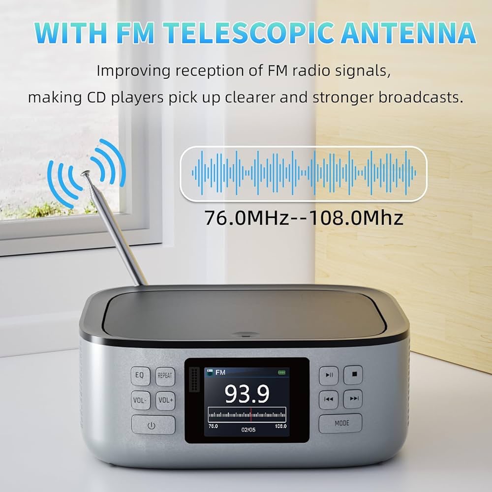 پخشکننده رادیو سیدی خانگی: این پخشکننده سیدی قابل حمل دارای یک رادیو FM باند کامل داخلی است که قادر به دریافت کانالهای 76 مگاهرتز تا 108 مگاهرتز است. میتوانید در حالت FM از راحتی خانه خود به آب و هوا، اخبار فوری، موسیقی و اطلاعات ترافیک گوش دهید. آنتن تلسکوپی FM به رادیو سیدی اجازه میدهد تا سیگنالهای رادیویی واضحتر و قویتری را دریافت کند.