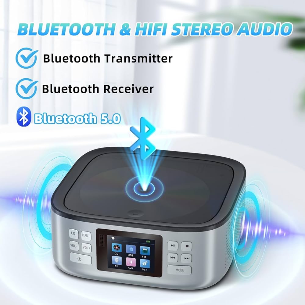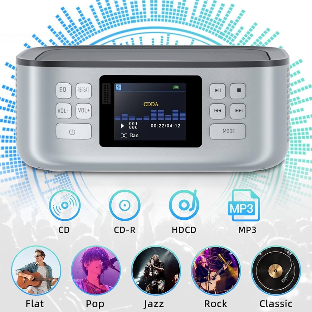 دستگاه پخش سیدی چندکاره: به طور گسترده با سیدیها، سیدی-آرها، سیدیهای HD و MP3 سازگار است. از حالتهای پخش معمولی، تکرار تک آهنگ، تکرار تمام آهنگ، پخش تصادفی و تکرار A-B پشتیبانی میکند. دستگاه پخش سیدی قابل حمل ماشین دارای پنج حالت EQ است: تخت/پاپ/جاز، راک و کلاسیک، تا نیازهای صوتی شما را برآورده کند. این دستگاه پخش سیدی بلوتوث برای آشپزخانه، اتاق نشیمن، اتاق خواب، باشگاه ورزشی، خانه و دفتر و غیره عالی است.