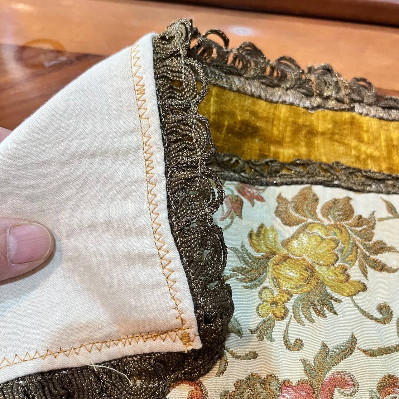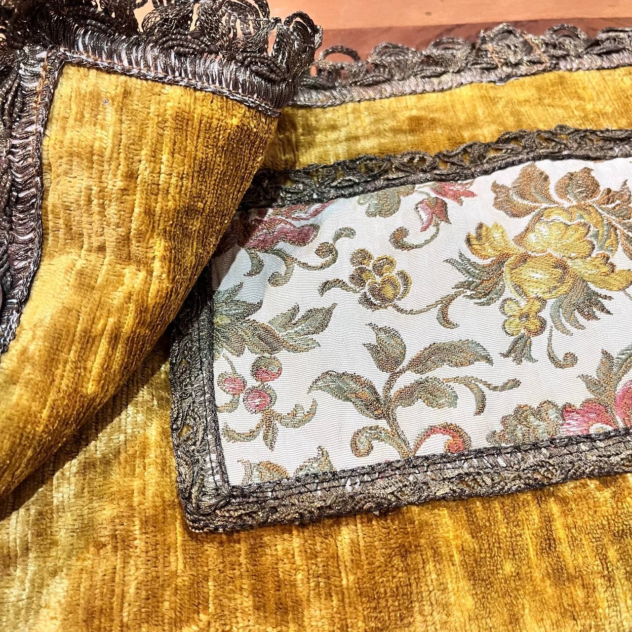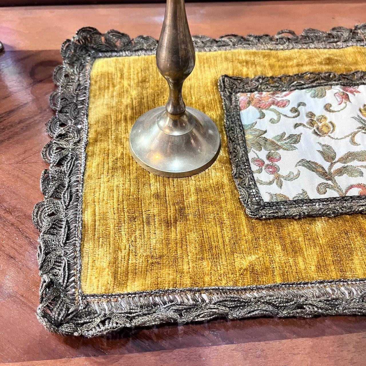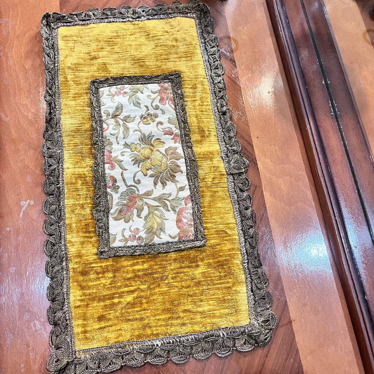 رومیزی مخمل خردلی طلایی زیبا و خوش رنگ ترکیب مخمل و پارچه شنل با یراقهای سیمی قدیمی