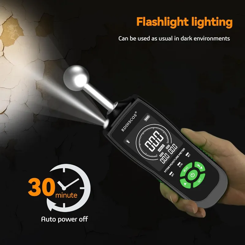 تشخیص نشت: به راحتی در گوشه ها و اطراف قرنیزها با سنسور توپی شکل اندازه گیری کنید و مسیر مهاجرت را به سمت منبع پنهان رطوبت دنبال کنید. MT68 برای استفاده فوری آماده است، با زمان پاسخ سریع در طول اندازه گیری. می تواند به پیمانکاران، نجارها و صاحبان خانه در