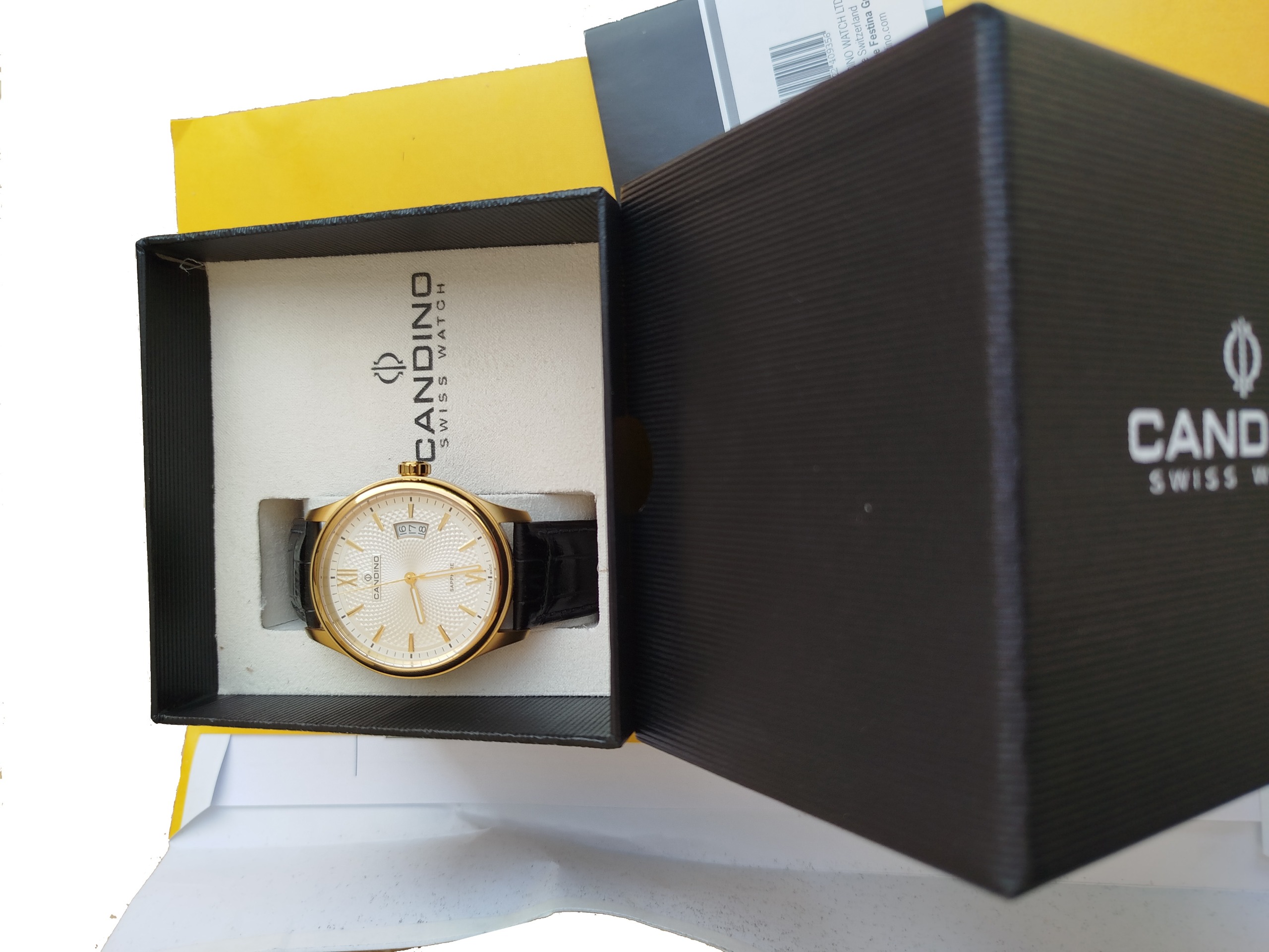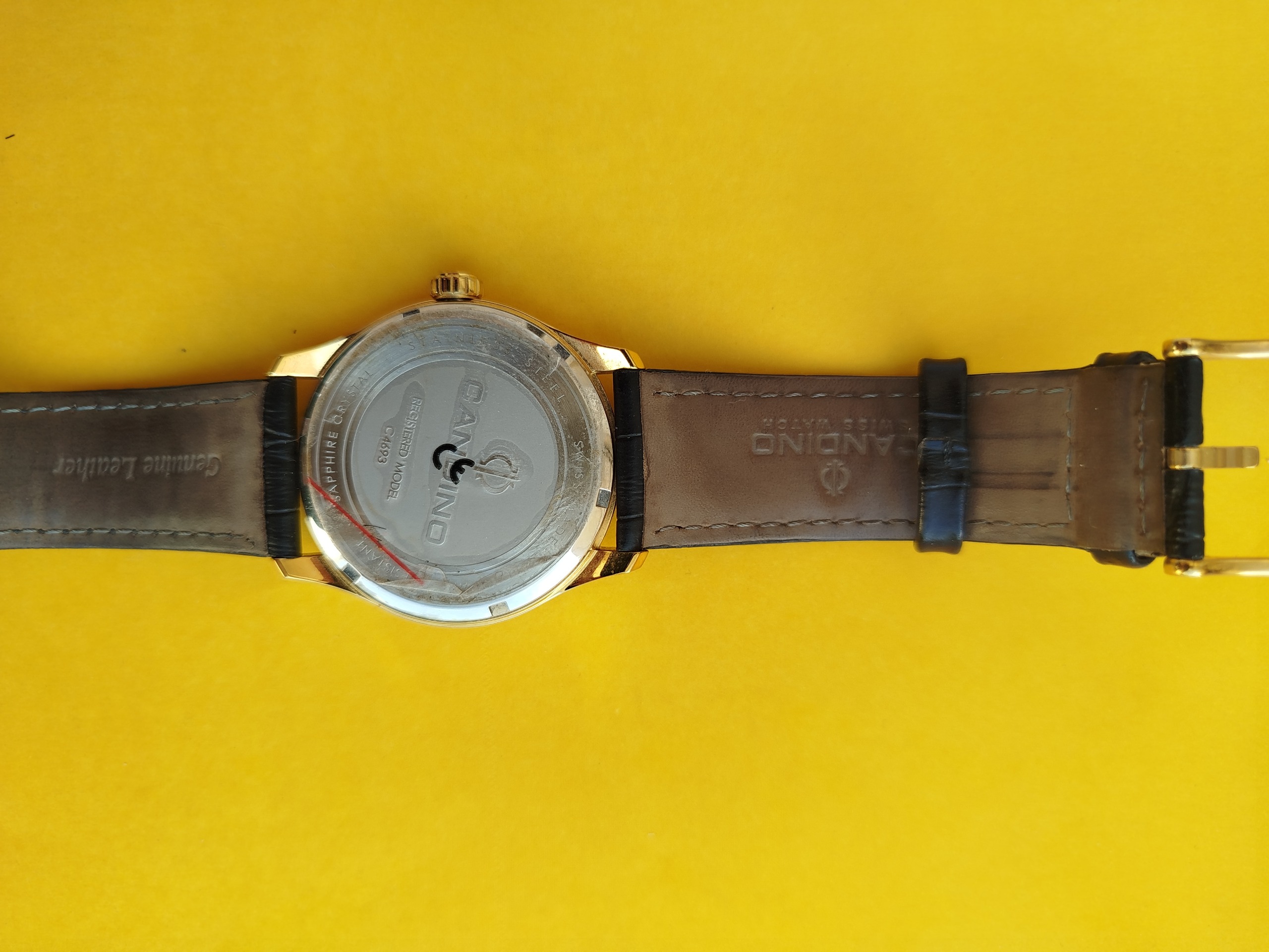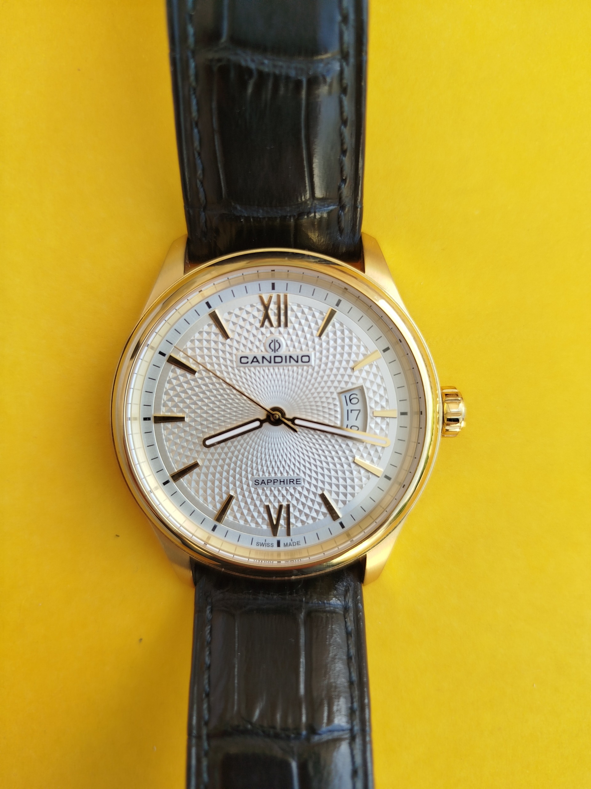 ساعت مچی مردانه بند چرمی، ضد آب تا 50 متر، دارای نشانگر تاریخ، عقربه شب نما، قطر صفحه 43 میلی متر، قاب استیل با روکش PVD زرد ، جنس شیشه کرسیتال سافایر، ساخت سوئیس