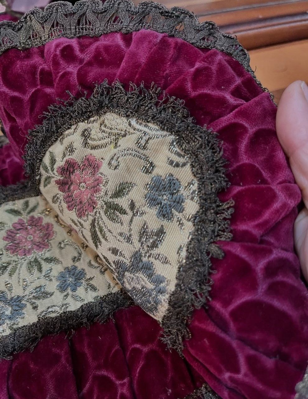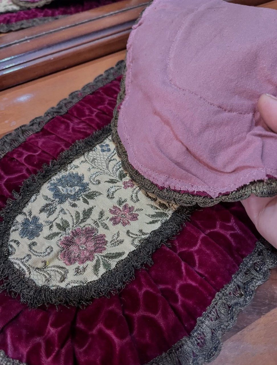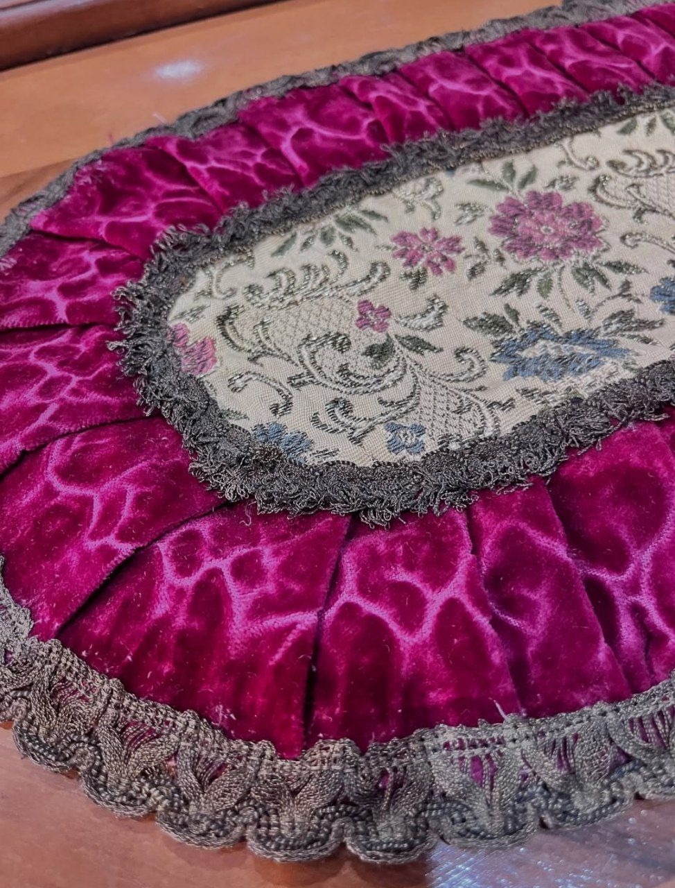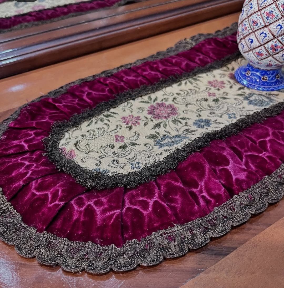 رومیزی زیبای قدیمی ترکیب مخمل طرح دار و چین خورده و پارچه شنل با یراقهای سیمی آنتیک