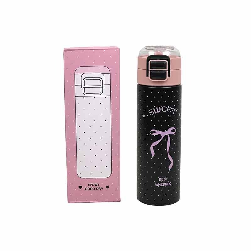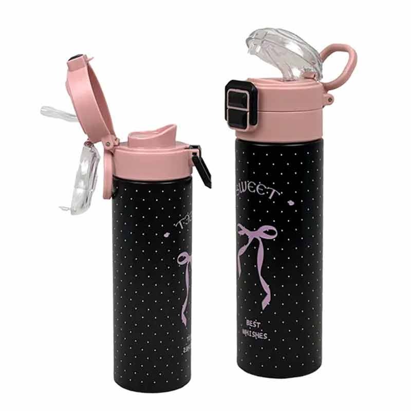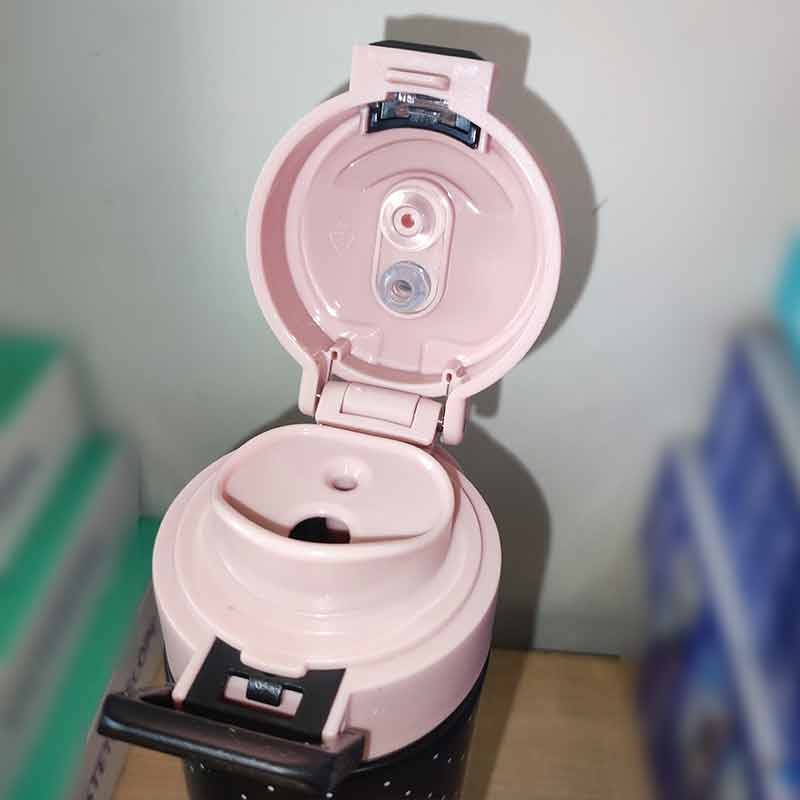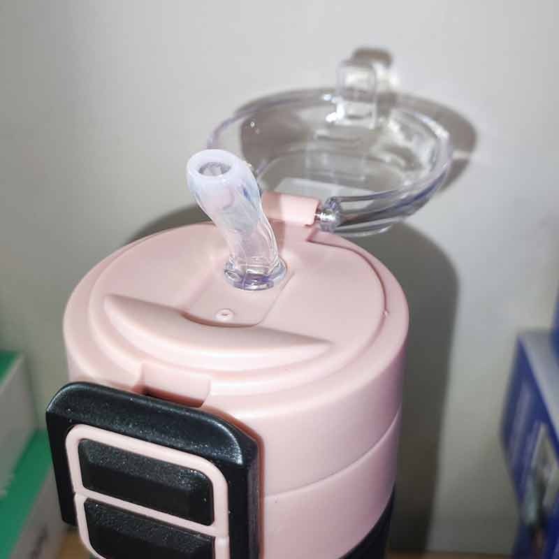 شده است. با فشردن یکی از دکمهها نی و با فشردن دکمه دیگر آسان نوش باز میشود که میتوانید بنا بر نیاز از هر کدام از آنها استفاده کنید. در پشت سر قمقمه یک دسته برای حمل راحت قمقمه وجود دارد. این قمقمه دارای یک جعبه شیک است که میتوانید آن را به دیگران هدیه