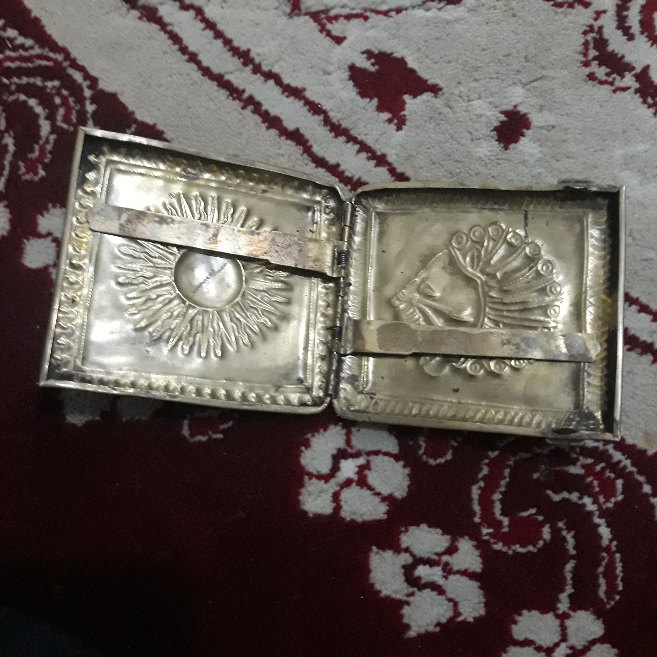 جعبه سیگار جنس برنجی با قلم دست ایرانی بسیار انتیک اروپائی فقط گیره های سیگار شل شده که با تعویض فنر درست میشه ظاهر وباطن همونه که درتصویره یه طرف کله شیر وطرف دیگه خورشید قلم زنی شده
