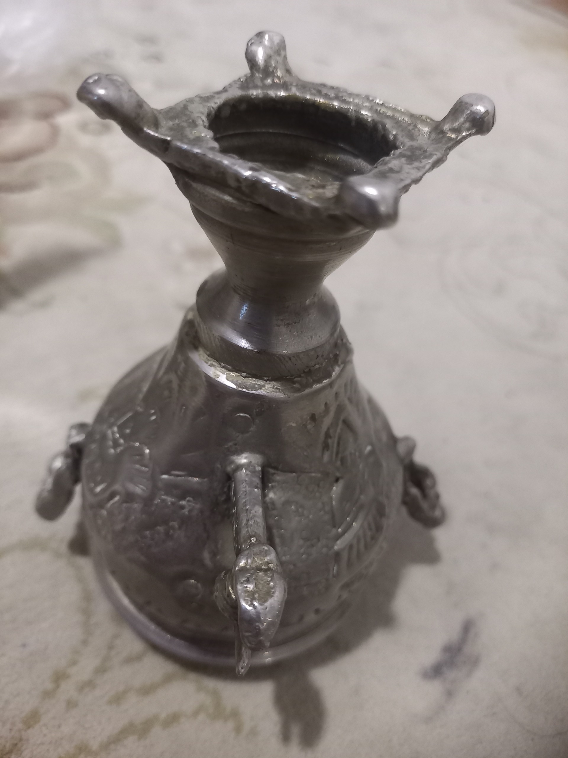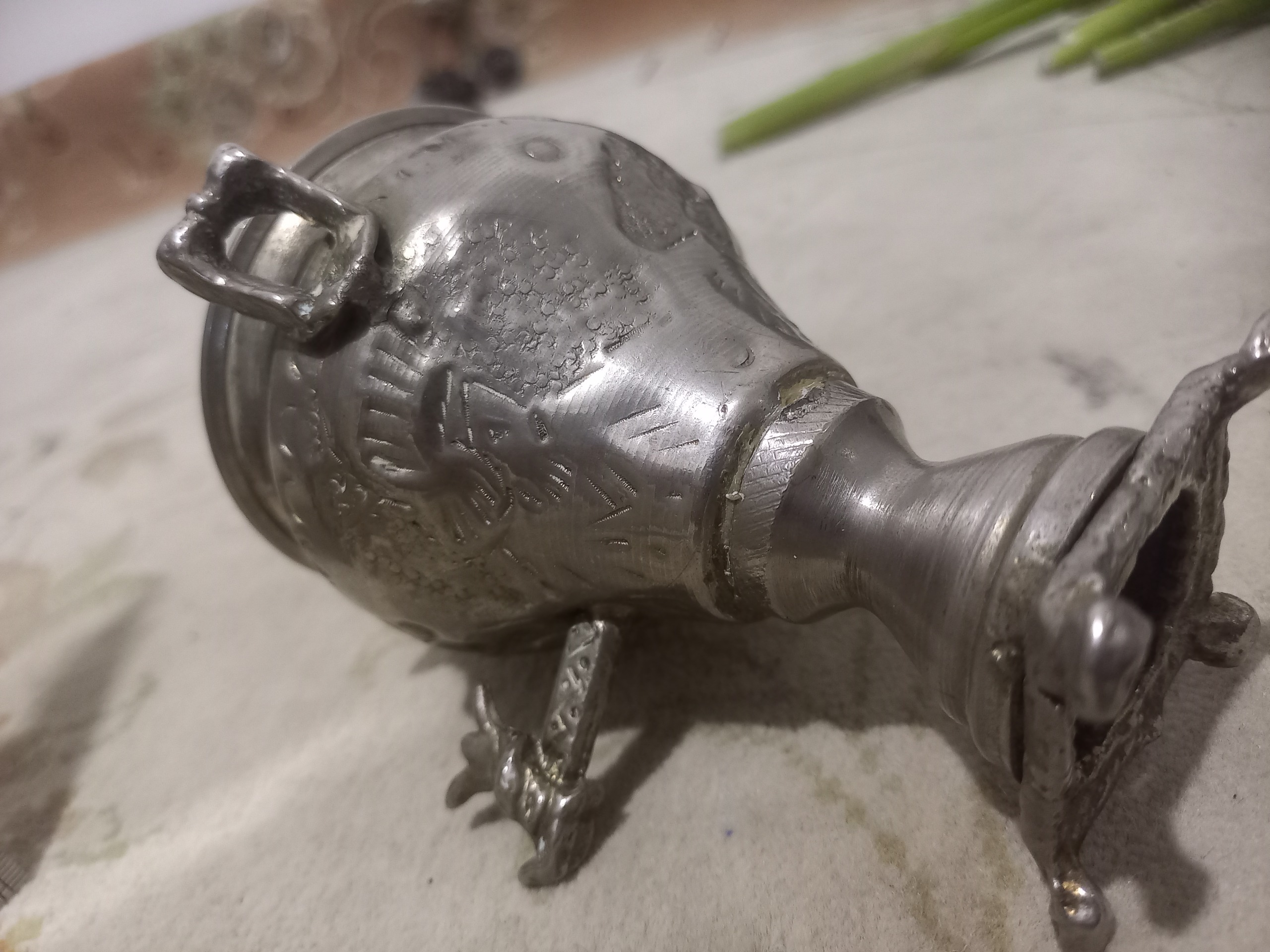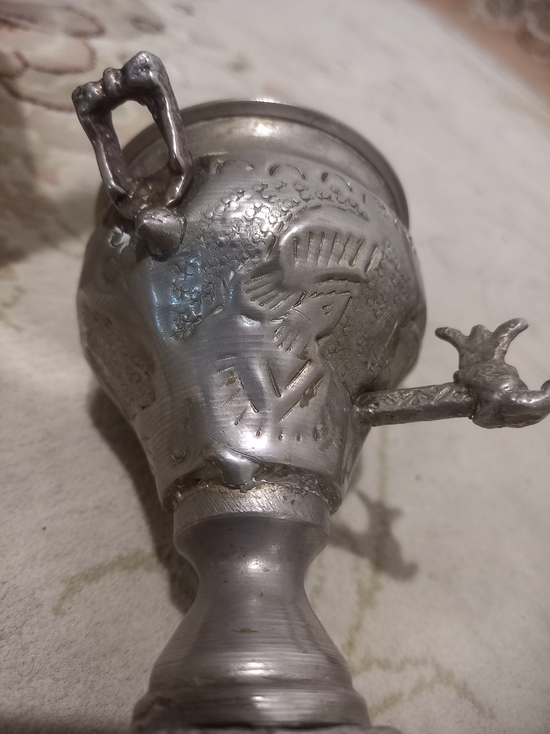 سماور تمام قلمزنی شده بسیار قدیمی صحیح وسالم فقط درب بالا ندارد احتمال زیاد نقره یا روکش نقره است نمیدانم کارشناسی با خود شما بسیار محکم زیبا وارزشمند با قدمت زیاد برای سیسمونی اعیان وبزرگان قاجار یا پهلوی بوده اگر نقره باشه که قیمتش بسیار بالاست مفت چنگ برنده مزایده اگر م روکش باشه باز هم یک چهارم قیمت وآقای اس
