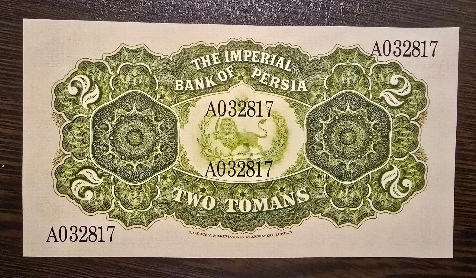 دو تومان سری اول ناصرالدین شاه قاجار پشت سبز ، فقط در طهران ادا خواهد شد.طرح و کپی این اسکناس از روی نسخه اصلی در انگلستان اجرا شده است.با امضای آقایان جیمز اچ. مک موری و وی. ال. والتر.اصل این اسکناس با کیفیت بسیار پایین حدود 400 میلیون تومان خرید و فروش میشود.