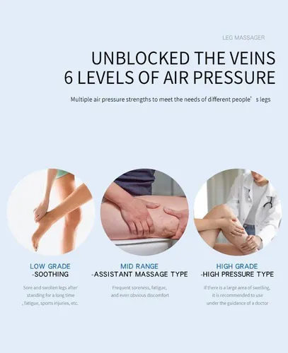 ماساژور پا فشاری. این ماساژور فشرده سازی پا دارای کیسه هوای داخلی 10×2 است، فشردن دست را برای فشرده کردن عضلات ساق پا و ران شبیه سازی می کند، باد و باد می کند، خستگی پاها را برطرف می کند و گردش خون را بهبود می بخشد و به شما یک تجربه ماساژ عمیق عضلات پا را می دهد.