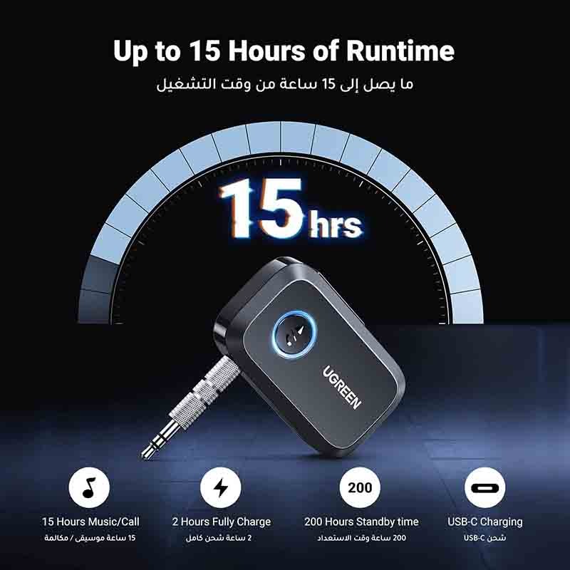 عمر باتری 15 ساعت و شارژ سریع با باتری داخلی با ظرفیت بالا، آداپتور بلوتوث A UGREEN میتوان به طور مداوم به مدت 15 ساعت پخش شود یا به مدت 200 ساعت در حالت آماده کار باشد. میتوانم آن را به طور کامل شارژ کنم.