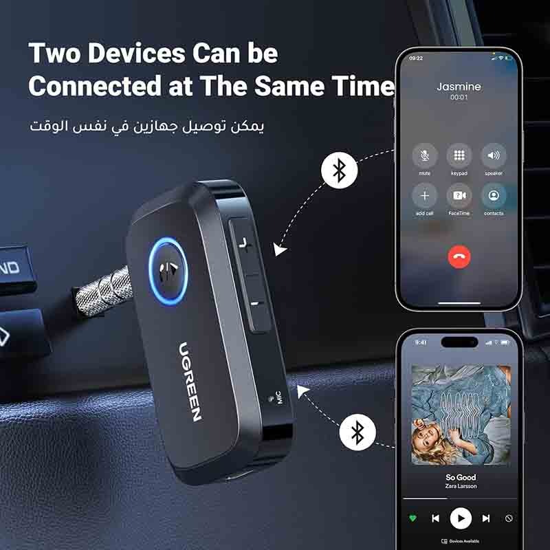 پشتیبانی از اتصال دو دستگاه گیرنده UGREEN بلوتوث 5.4 از اتصال همزمان دو دستگاه پشتیبانی میکند. میتوانید هنگام رانندگی با دستگاههای راحتی را با تماس و موسیقی تغییر دهید و در مهمانیها با دوستانتان موسیقی را عوض کنید.