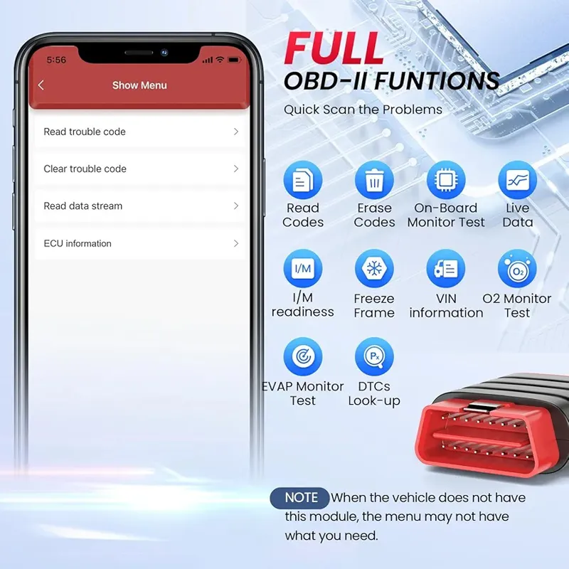 تشخیص همه سیستمها این اسکنر بلوتوث obd2 از تمام عملکردهای تشخیصی سیستمها پشتیبانی میکند، میتواند کدهای خطا را بخواند/پاک کند، دادههای زنده را بخواند، اطلاعات ماژول کنترل را بخواند، تستهای فعالسازی و عملکردهای تعمیر و نگهداری را برای ECM، BCM، SRS، TCM، BMS، TPMS، SAS، سیستم A/C و غیره انجام دهد.