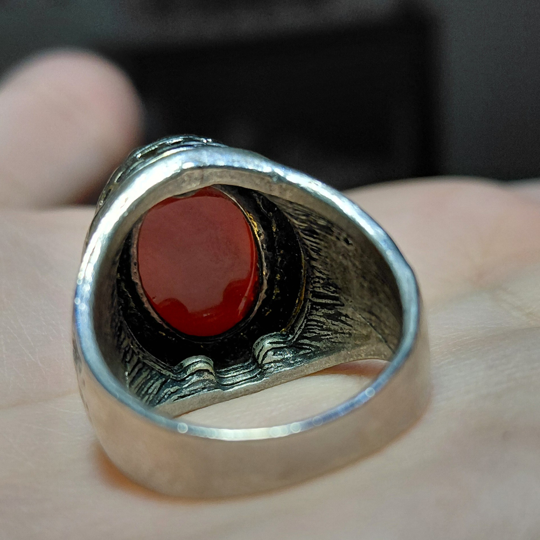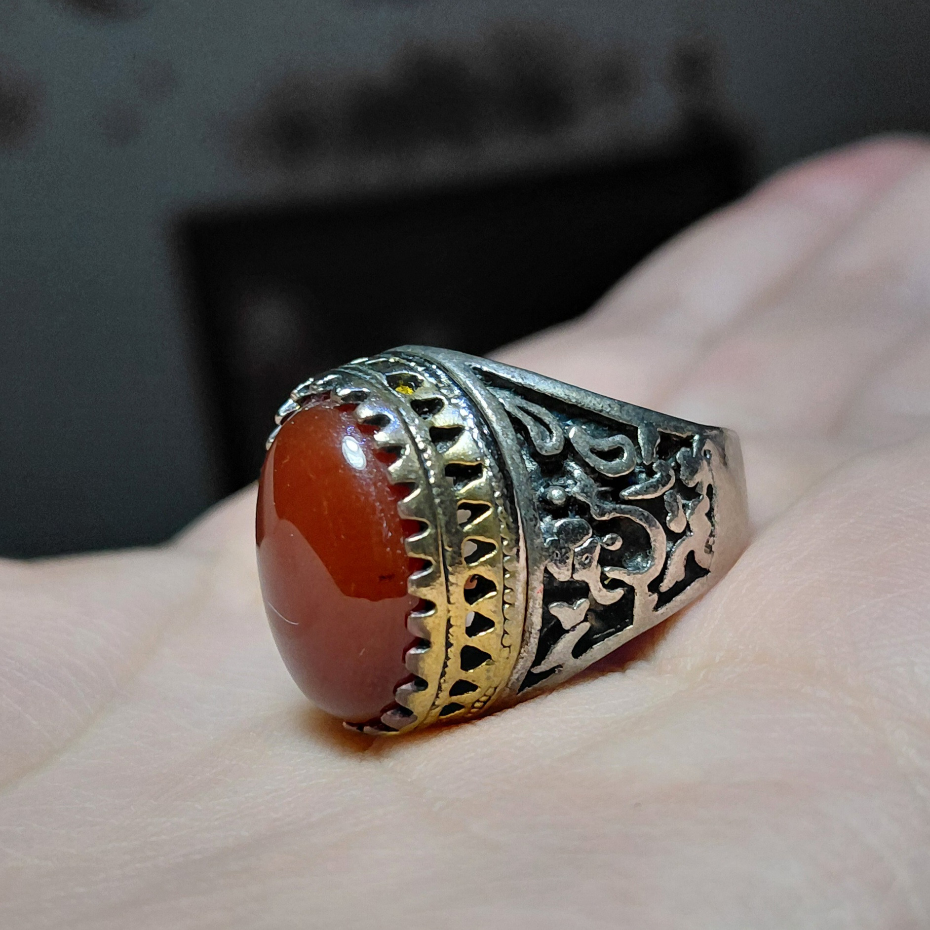 انگشتر عقیق چند رنگ با رکاب طرح قلم زنی