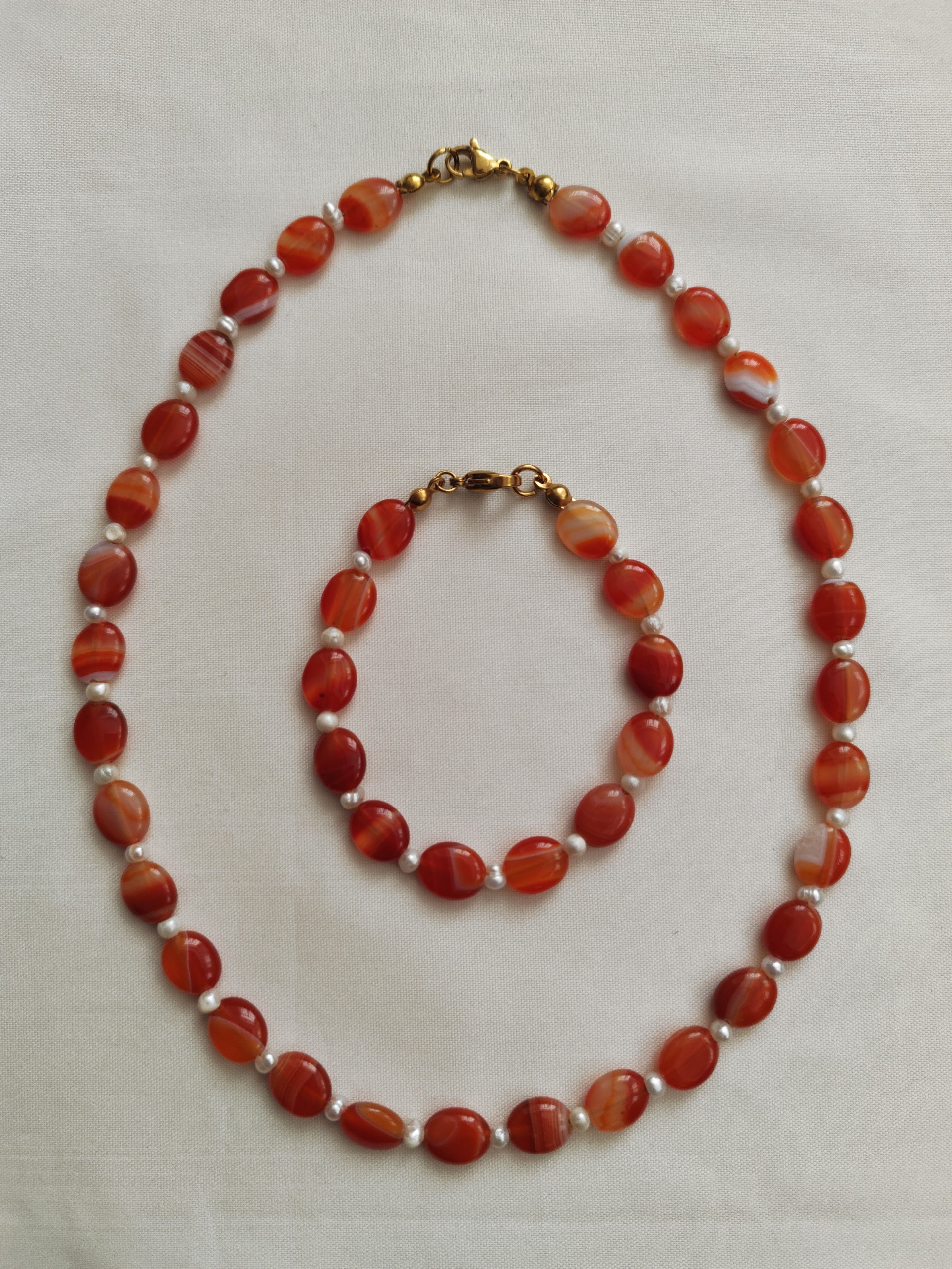 این نیم ست شامل دستبند و گردنبند و از مروارید پرورشی اصل سایز 4میل و عقیق نارنجی 8میل با کیفیت عالی ساخته شده.متریال استفاده شده استیل رنگ ثابت و ضد حساسیت می باشد.طول گردنبند 40سانتی متر و طول دستبند 28 سانتی متر و قابل تغییر متناسب با سایز دست شما می باشد.