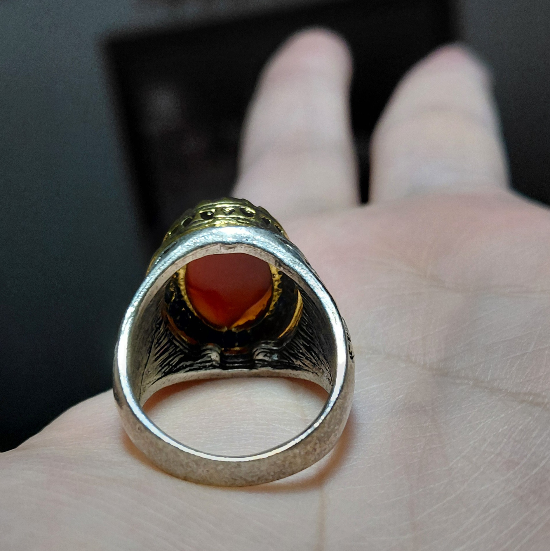 انگشتر با نگین عقیق ترکیبی و رکاب طرح قلم زنی