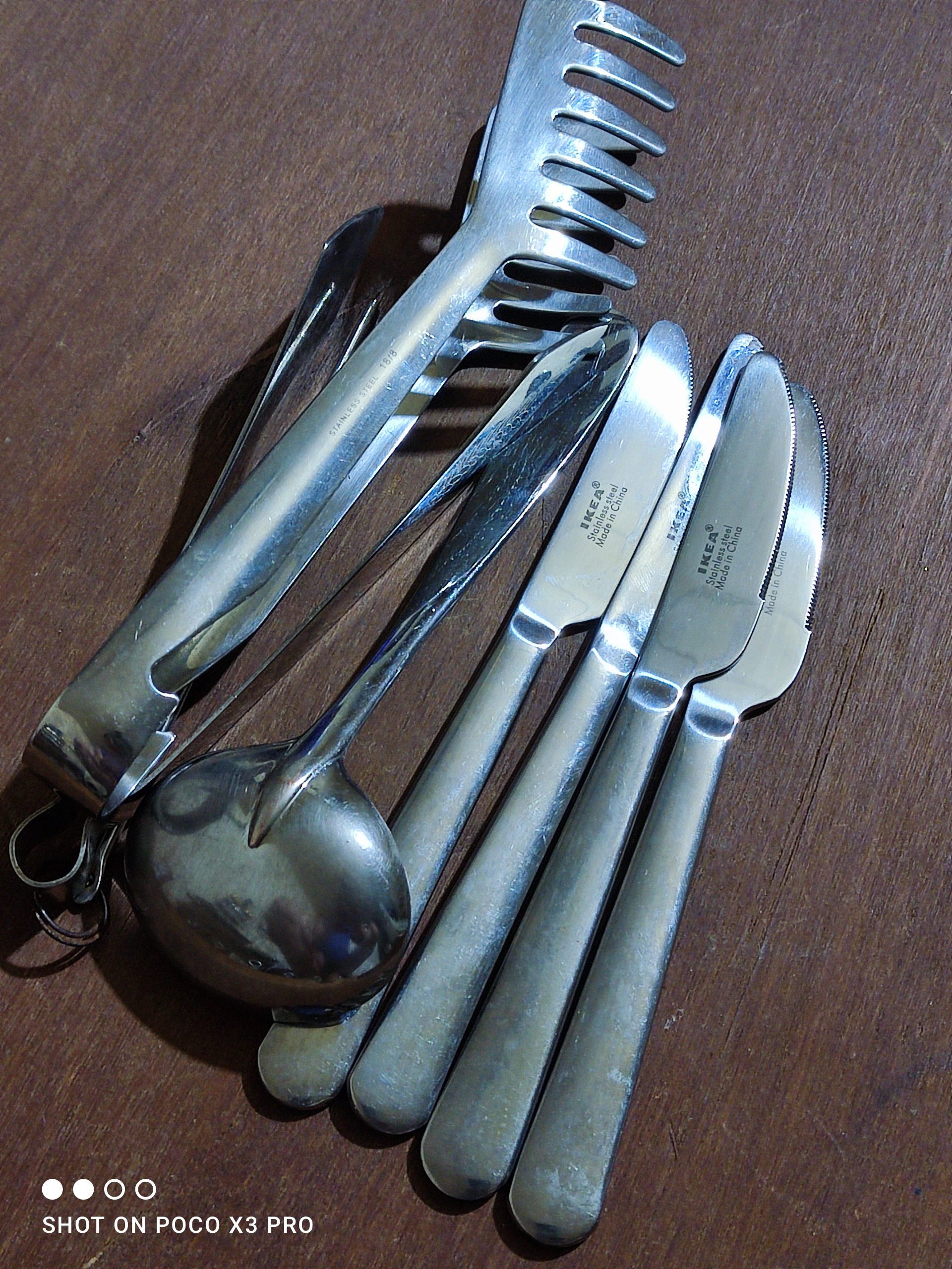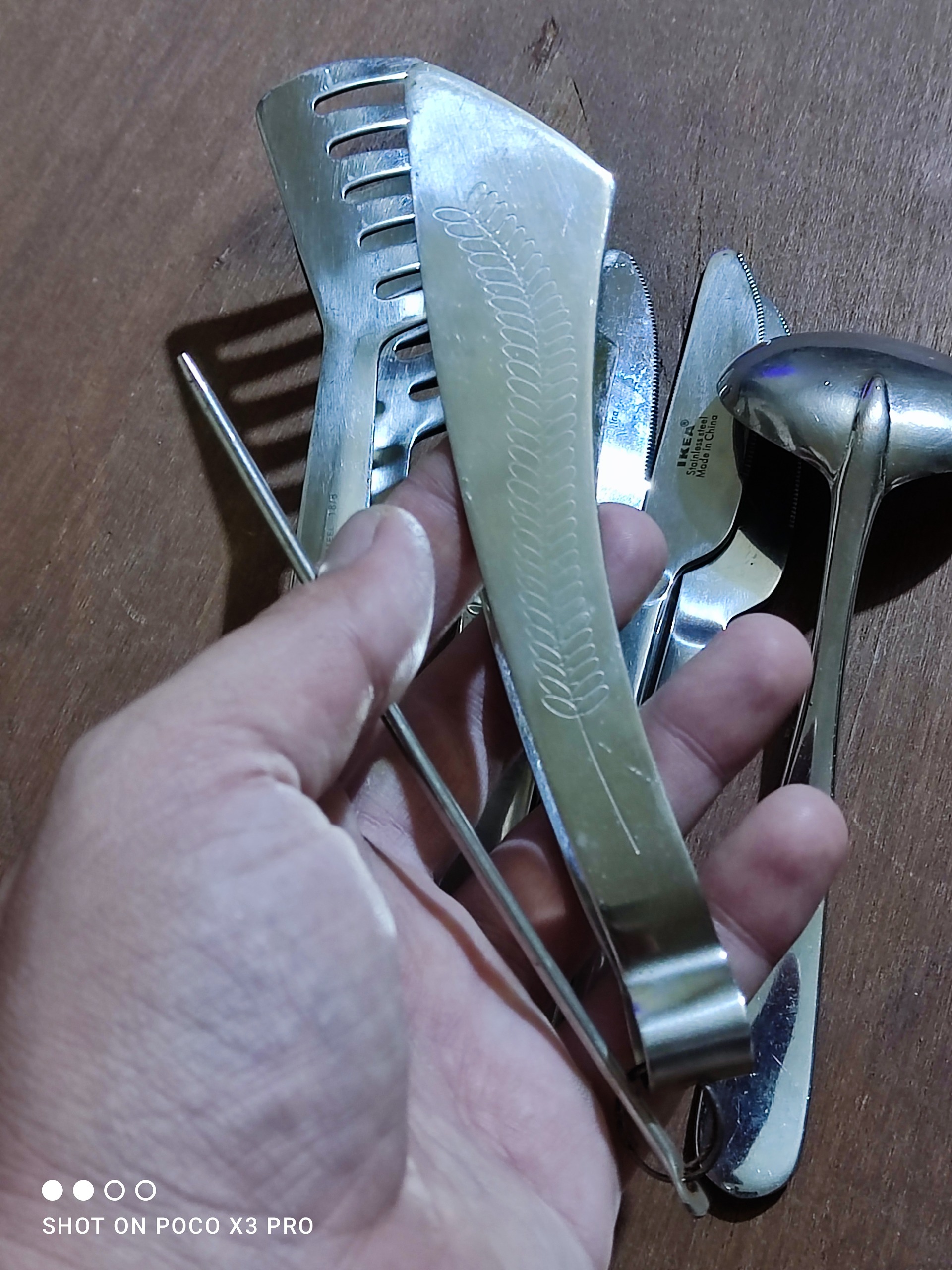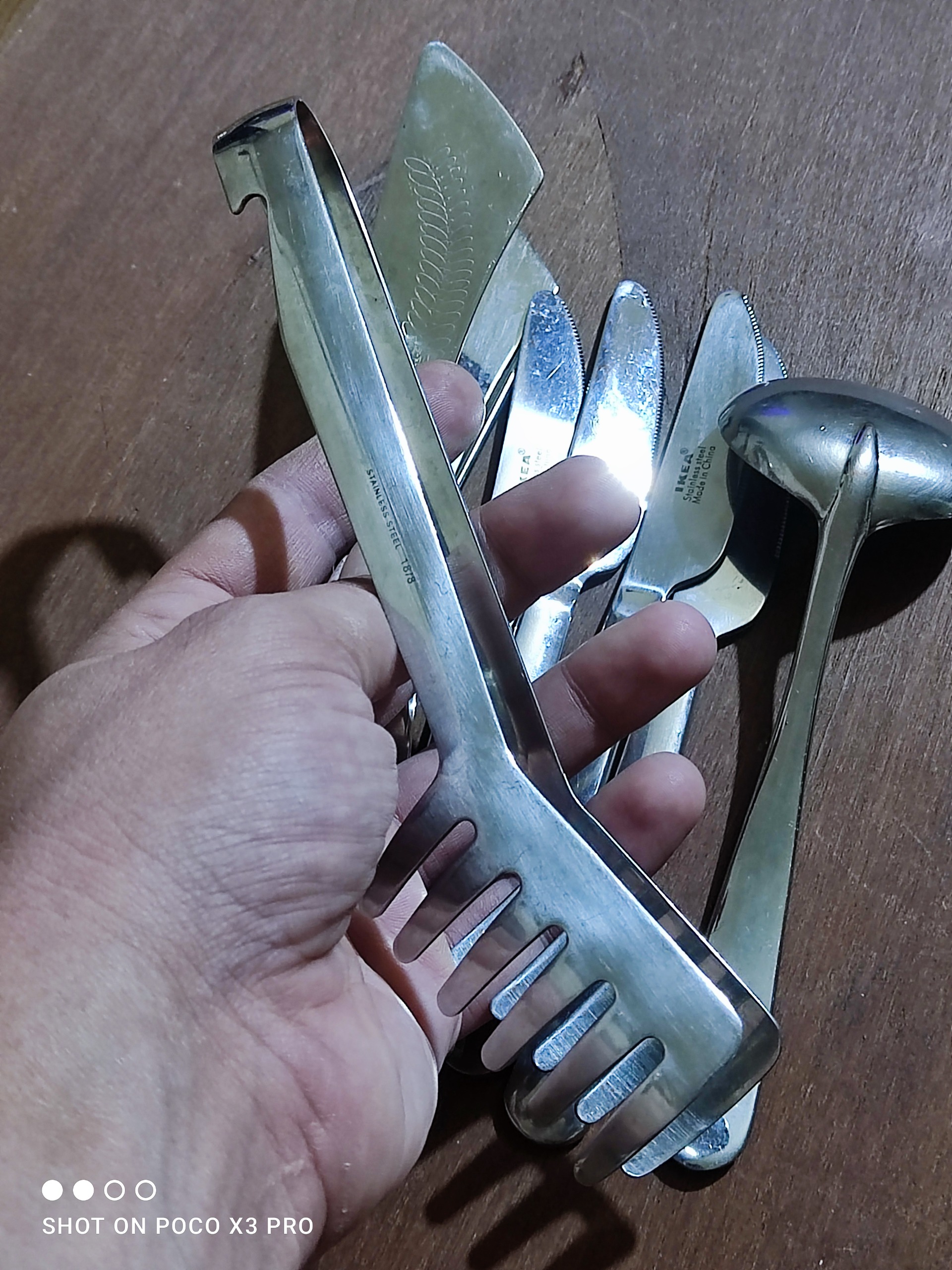 یک عدد قاشق یا ملاقه مخصوص آجیل/// چهار عدد چاقوی کره خوری آک سنگین و جوندار و مارکدار/// یک عدد انبر و یخ شکن پای هم هستن یه سیخ ازش چسبیده که برای شکوندن یخ استفاده میشده با انبرشم برمیداشتن///و یک عدد انبر مخصوص سرخ کردنی همگی قدیمی و مارکدار جنس لوکس و بسیار بکر و کلکسیونی قیمت برای همشه مطابق تصاویر