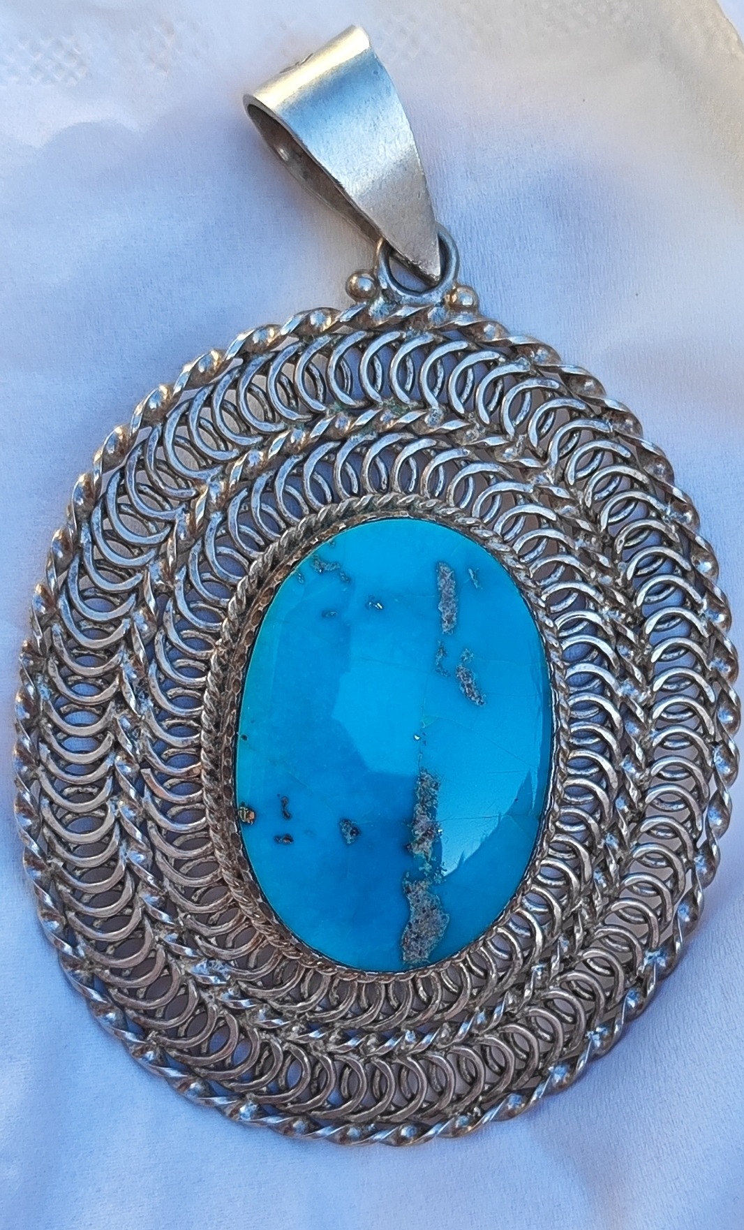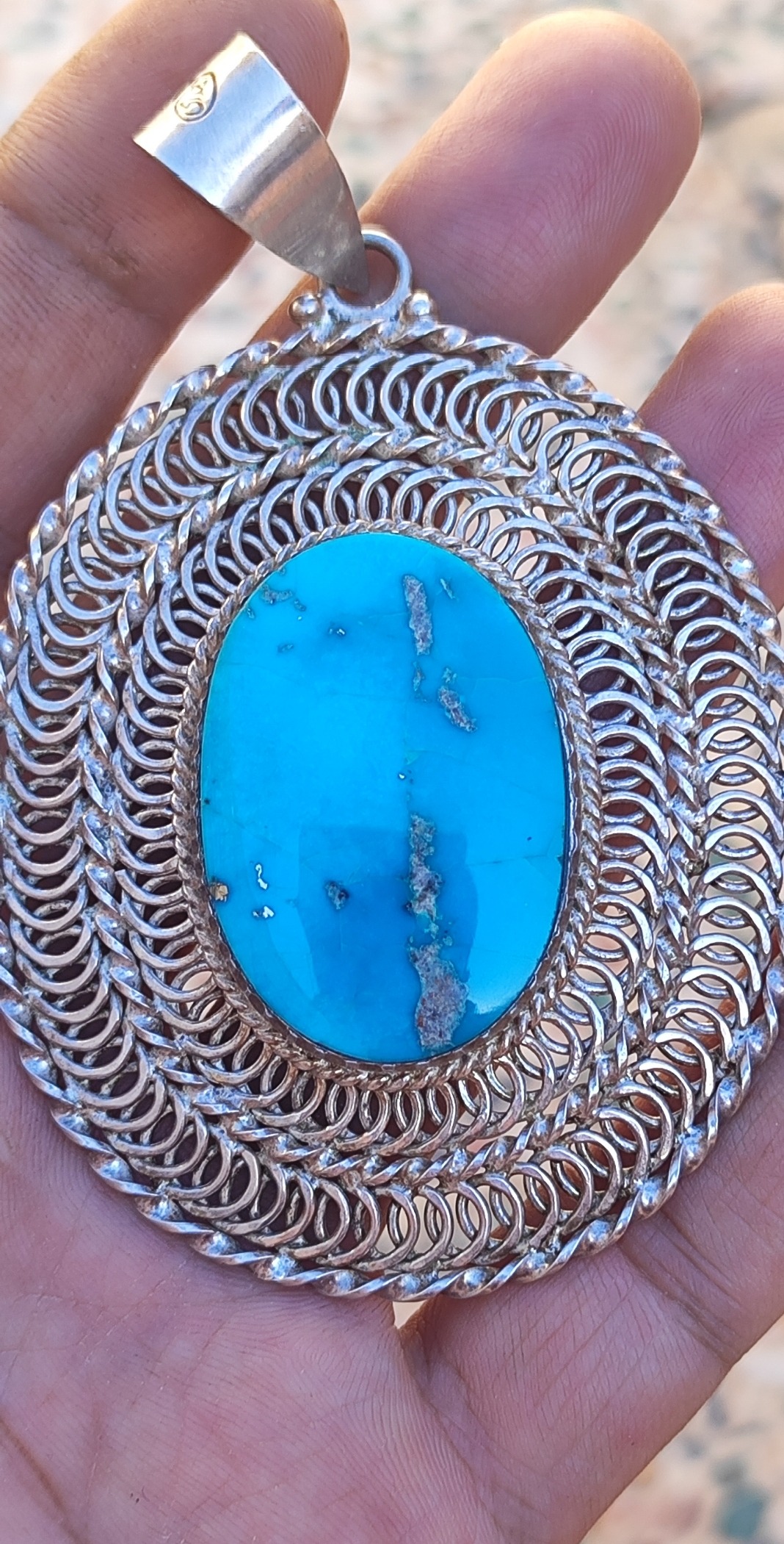 گردنبند بزرگ فیروزه نیشابور کاملا طبیعی بدون هر گونه احیا یا تقویت رنگ و پایه نقره 925