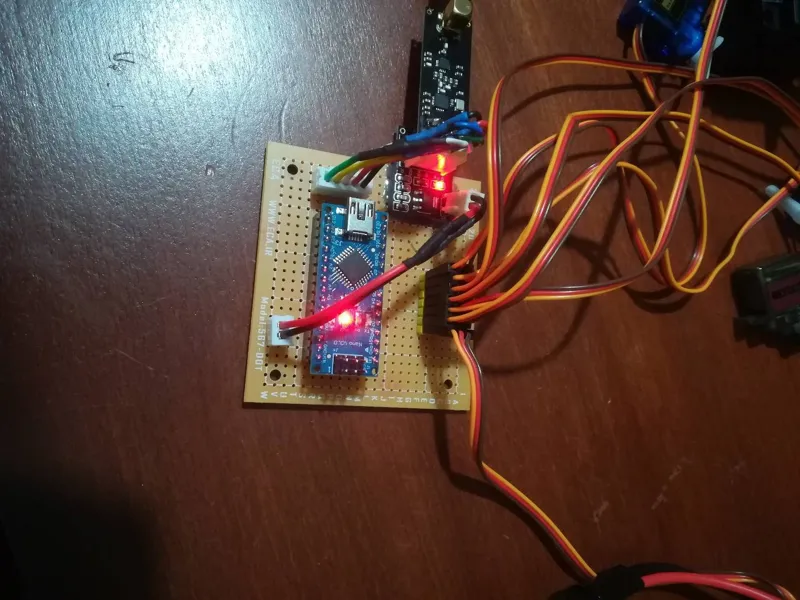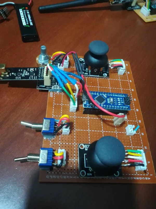 این رادیو کنترل دارای 6 کانال یک کانال ولوم و چهار کانال جوی استیک و یک کانال کلید کلنگی می باشد که با اردوینو ساخته شده و اماده بکار می باشد جهت پرواز هواپیمای ندل و ماشین بکاره میره و برای هواپیمای مدل 1500 متر برد هوایی داره . این رادیو کنترل با گیرنده از قطعات اصل تایوانی ساخته شده که برد بالاتری داره همین رادیو کنترل بروی هواپیمای مدل سوخو 27 ما نصب شده و حتی میتوانید به دلخواه پارامترهای کانال ها رو تغییر بدهید اگر برنامه نویسی بلد باشید ولی در کل رادیو برنامه نویسی شده و کاملا اماده هست با رادیو برنامه  هم براتون ارسال میشه که اگر خواستین خودتون یک دیگه درست کنین. کیت دارای قاب میباشد خیلی حرفه ای فرستنده خودش باتری داره