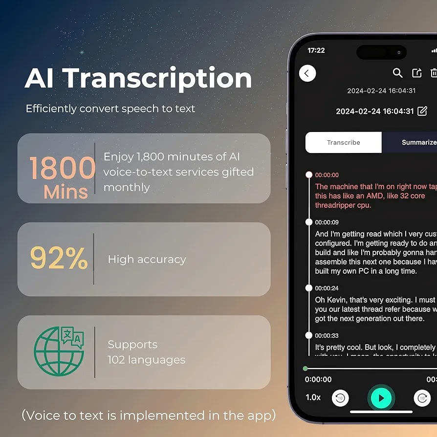 1800 دقیقه خدمات رایگان هوش مصنوعی در هر ماه: از 1800 دقیقه خدمات رایگان مبتنی بر هوش مصنوعی در هر ماه، از جمله تبدیل بسیار دقیق صدا به متن، خلاصه های تولید شده توسط هوش مصنوعی و ایجاد نقشه ذهنی، لذت ببرید. این ویژگیها از طریق برنامه قابل دسترسی هستند، در حالی که خود دستگاه ضبط صدا بر ارائه عملکرد ضبط درجه یک تمرکز دارد.