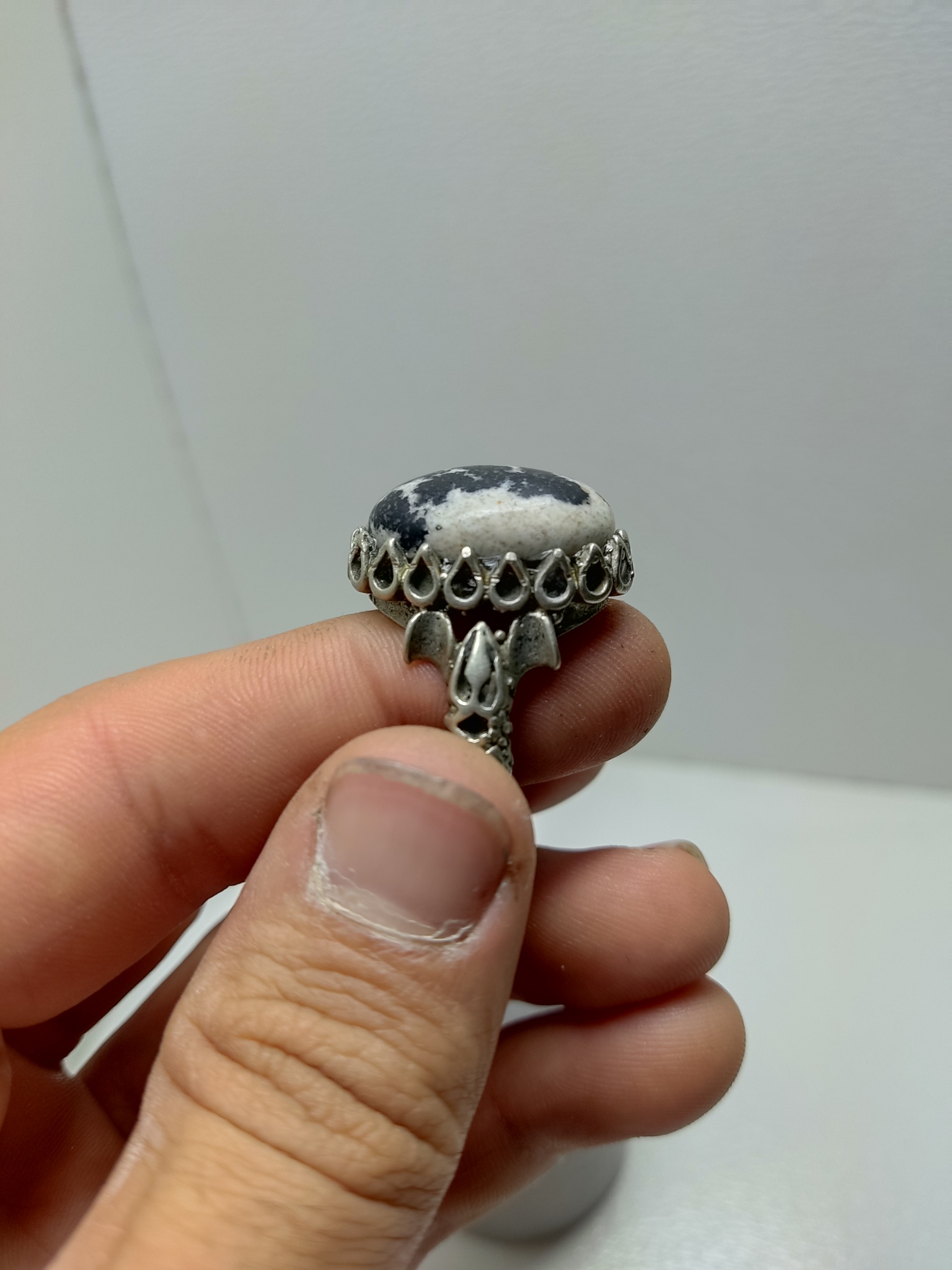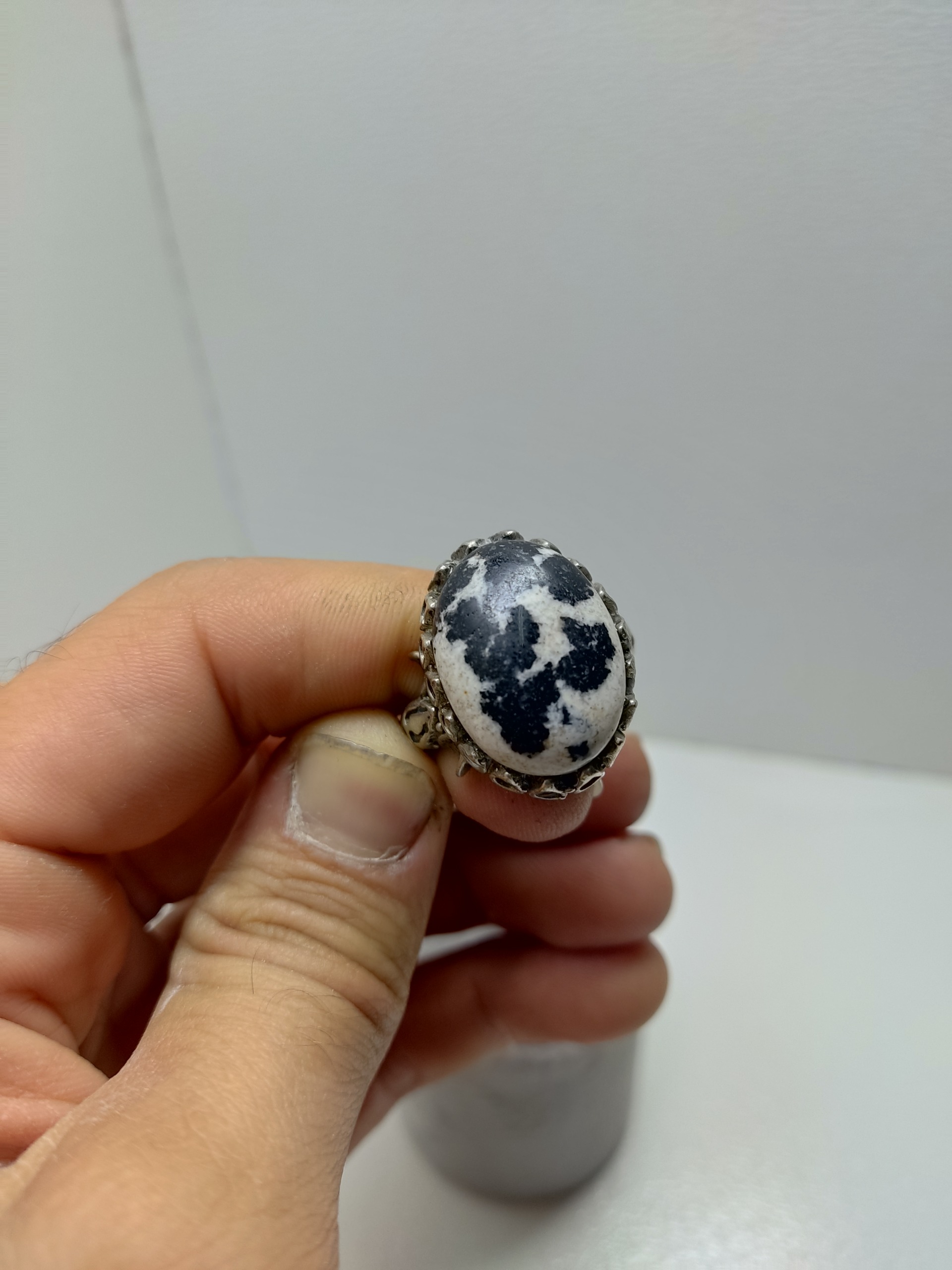 نگین تراش دست هستش و از سنگ جاسپر دالیمیشن یا به اسم دیگر جاسپر دالماتیان درست شده.