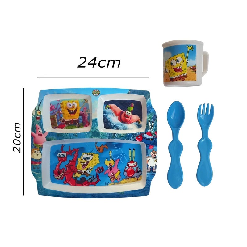 بشقاب کودک طرح باب اسفنجی شامل یک عدد بشقاب، لیوان و قاشق و چنگال است. تجهیزات از جنس پلاستیک ساخته شده اند. طرح کارتونی روی ظروف باعث جذابیت آن برای کودکان می شود. ابعاد بشقاب 24 در 20 سانتی متر است.
