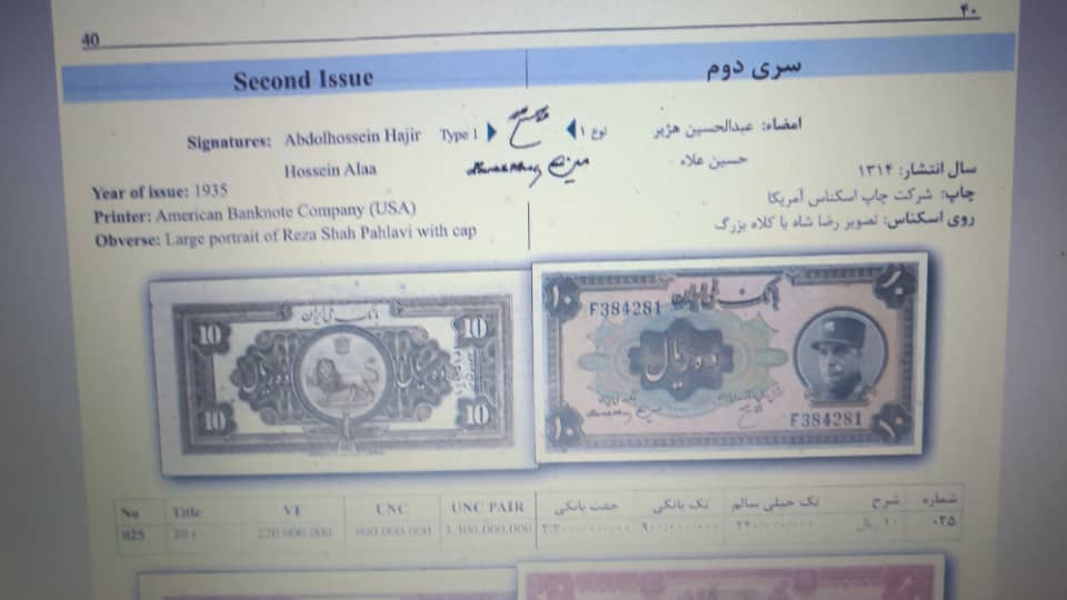 10 رضا شاه پهلوی شماره 25 در کتاب اسکناس کیفیت عالی 90٪