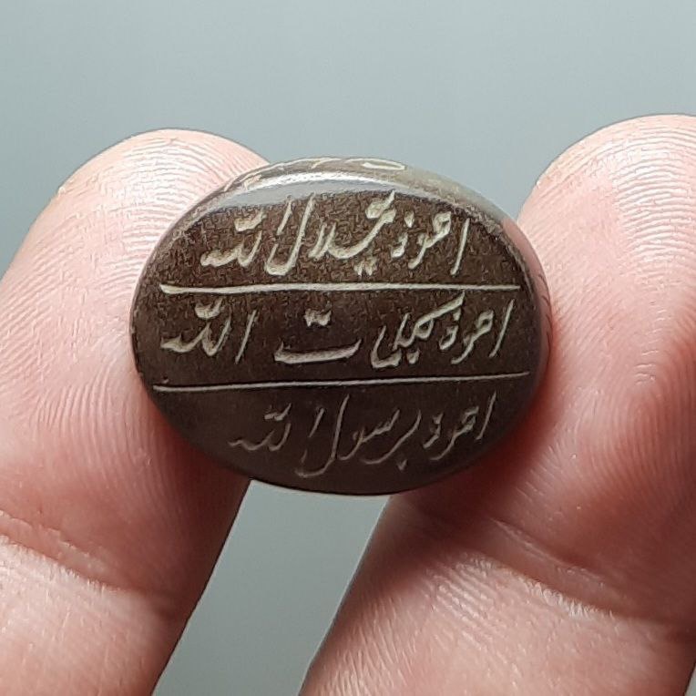 حدید سماغی رنگ خطی خوشرنگ اصل معدنی خراسان با رنگ طبیعی بدون بهسازی با حکاکی دستی دعای 7 جلاله در پشت و رو و کناره های سنگ ، جلادار