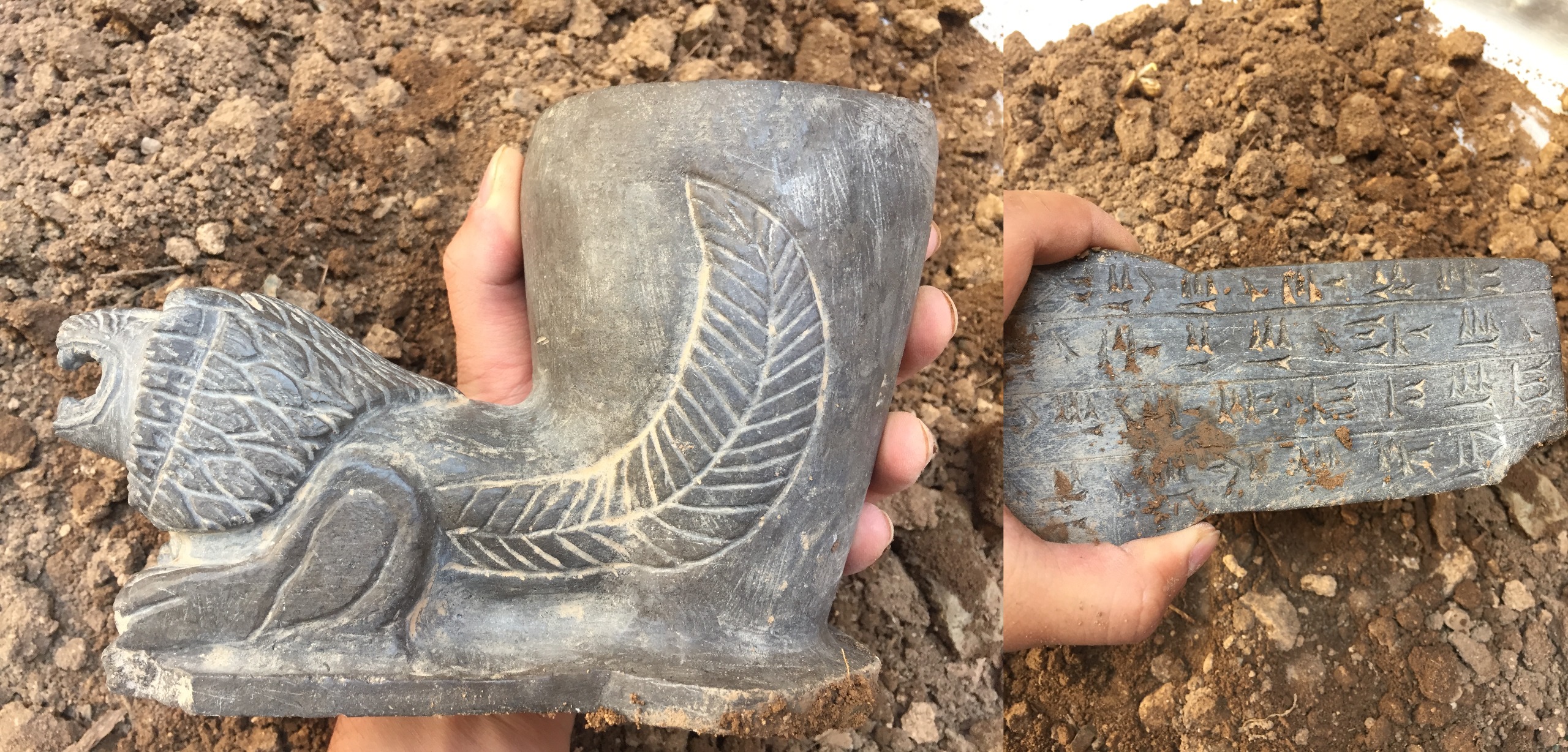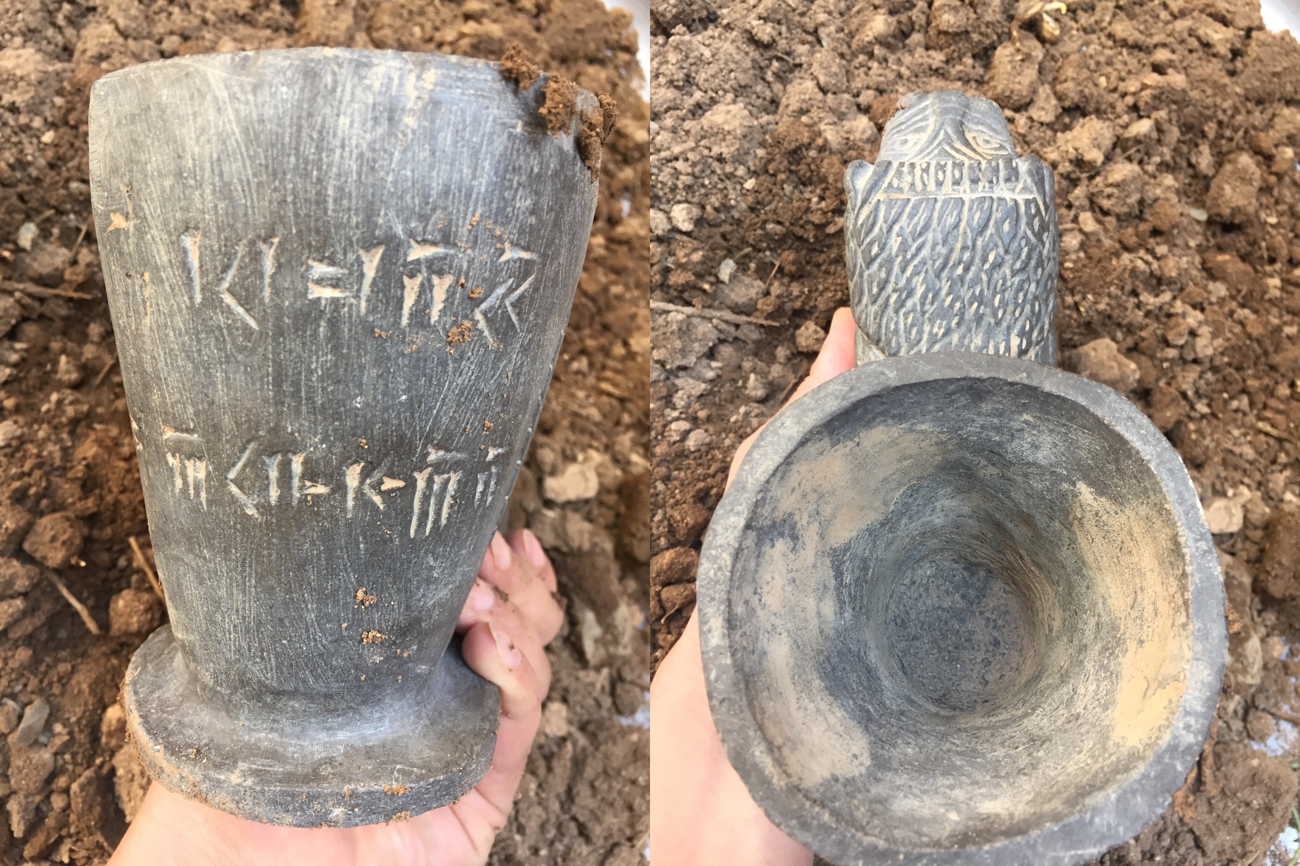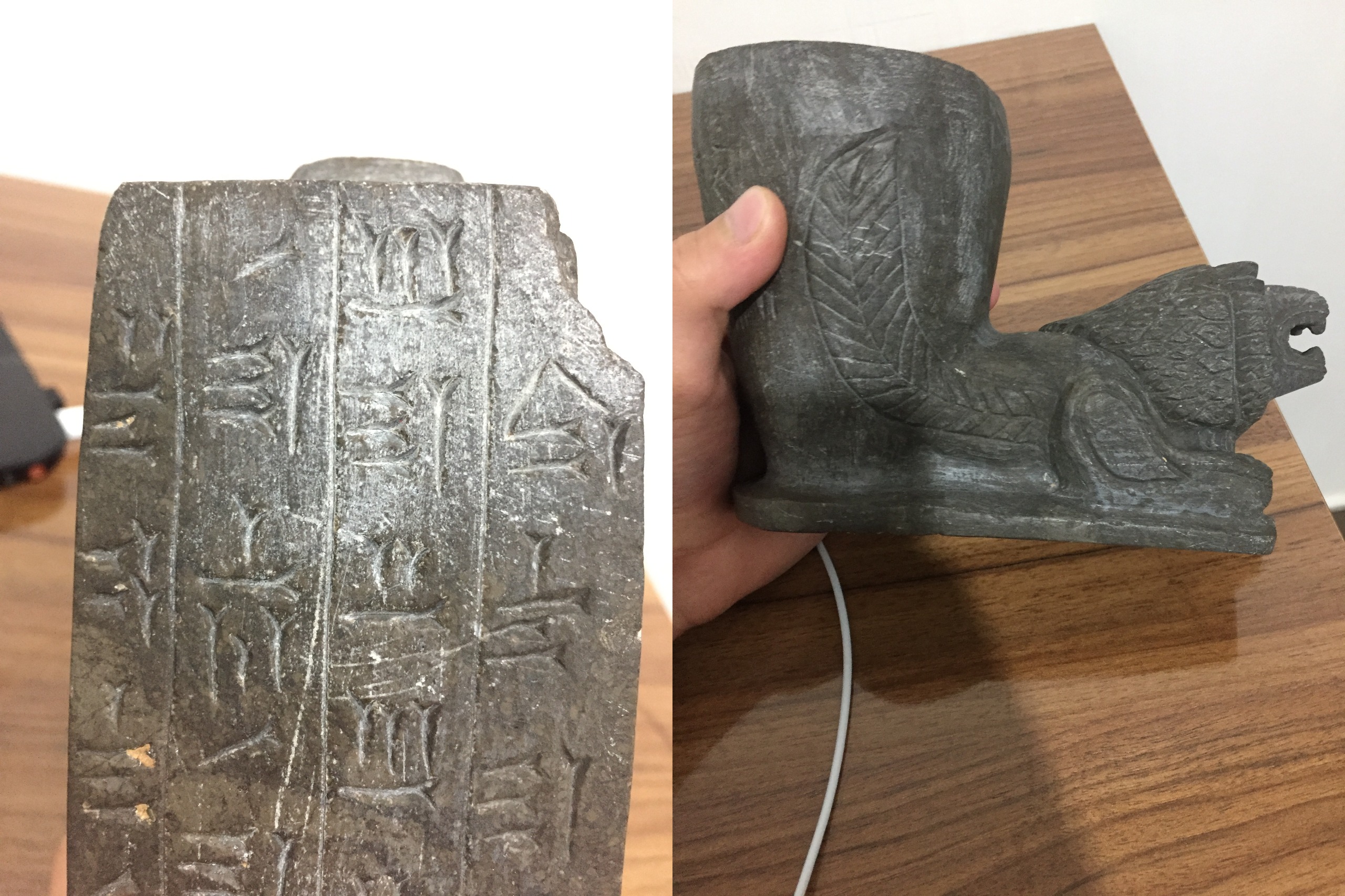 ریتون سنگی کاملا هنر دست و تقلید از اثار هخامنشی،حکاکی خط میخی و نقوش حیوانی اساطیری.