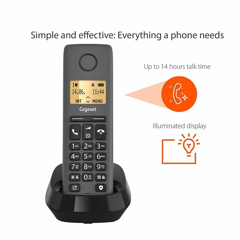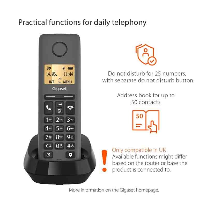 قابل اعتماد و همه کاره - Gigaset PURE 120 میتواند تا 25 شماره را متوقف کند و شما را در امان نگه دارد. فقط در سازگاری است. برای اطلاعات بیشتر به وب سایت Gigaset مراجعه کنید.