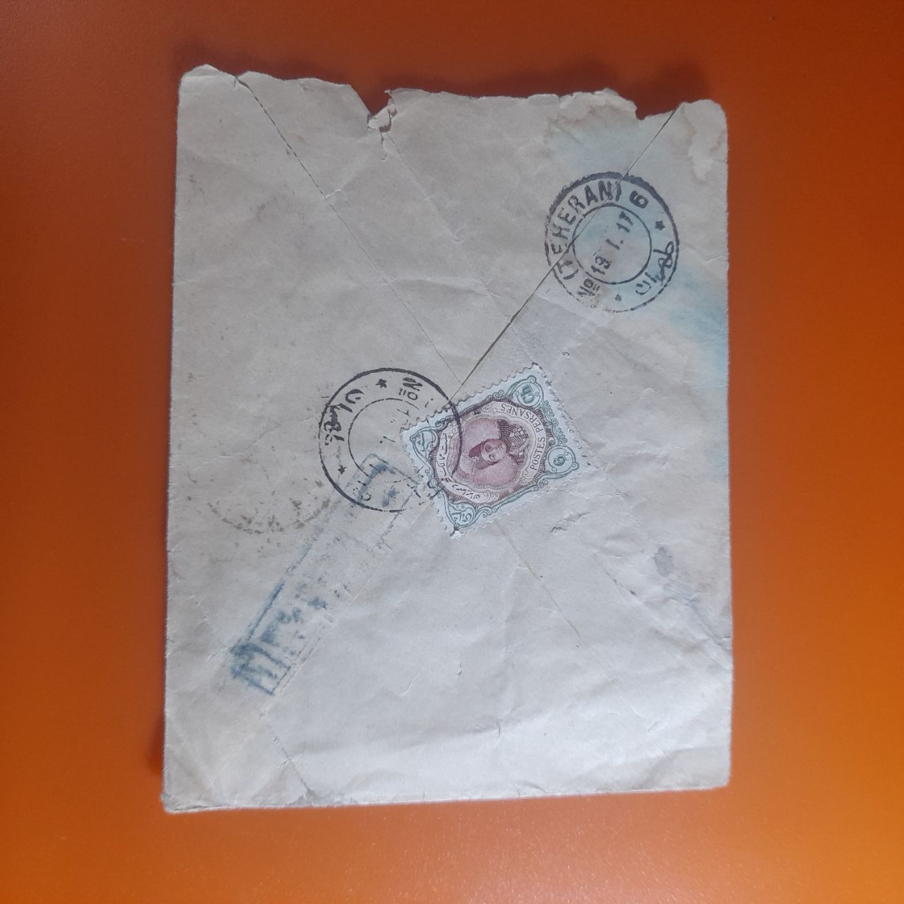 پاکت قاجاری ارسالی از تهران به بانک شاهی دراصفهان با مهر آبی رنگ و کمیاب "سانسورشده است"