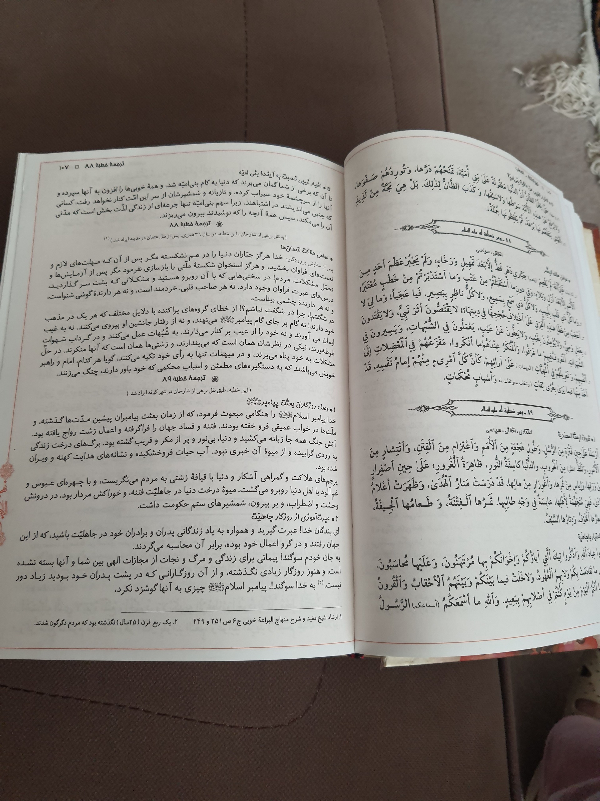 نهج البلاغه ترجمه مرحوم دشتی در حد نوجلدش کمی پاره بود که صحافی وتعمیر شده ورق ها سالم ونو هست چاپ دوازدهم هستتو عکس سالم وتمیز بودن صفحات مشخص هست