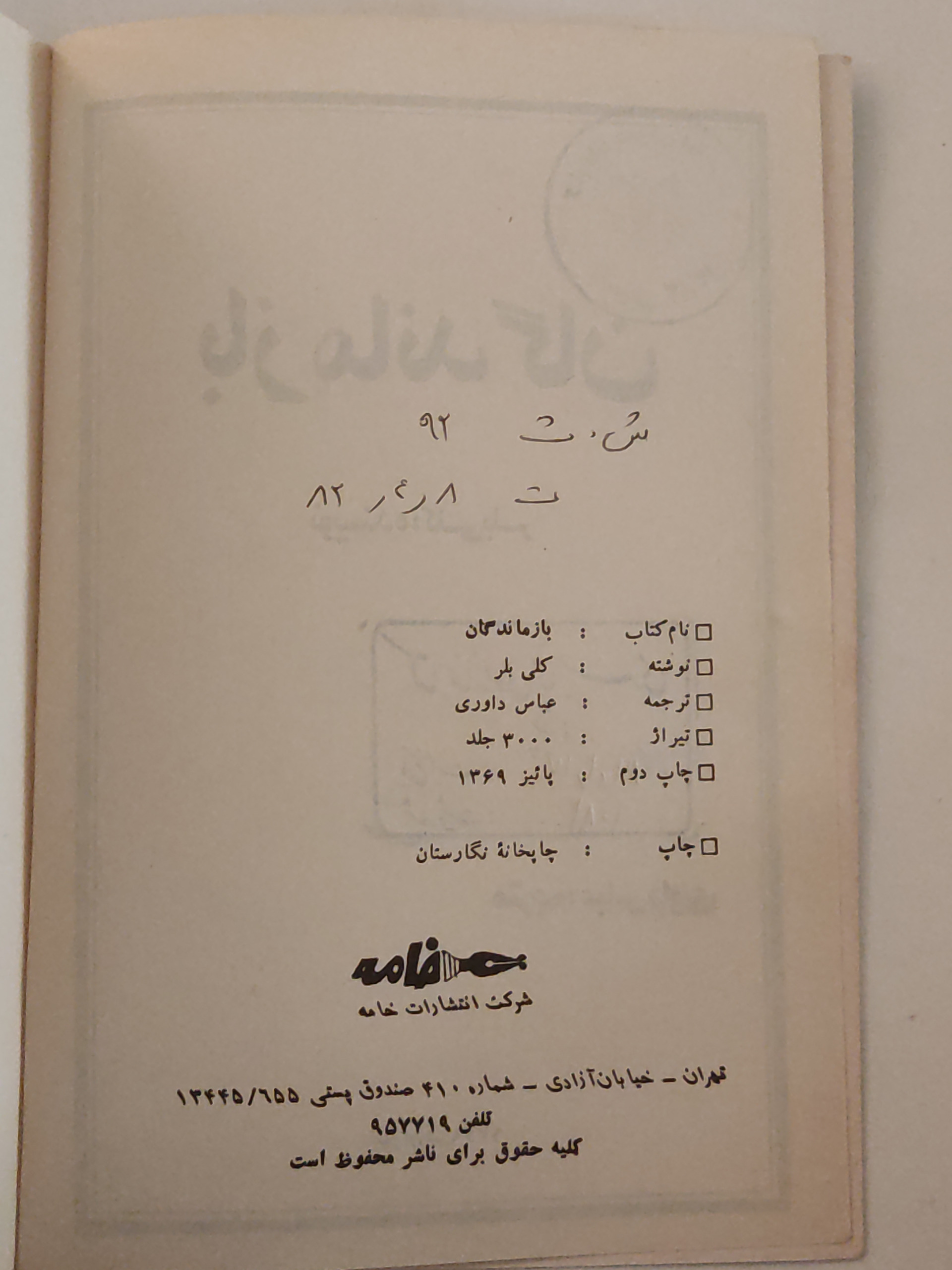 در چند جا کتاب مهر خورده ،نوشته کم در اول وورق آخر با خودکار دارد داخل کتاب تمیز است