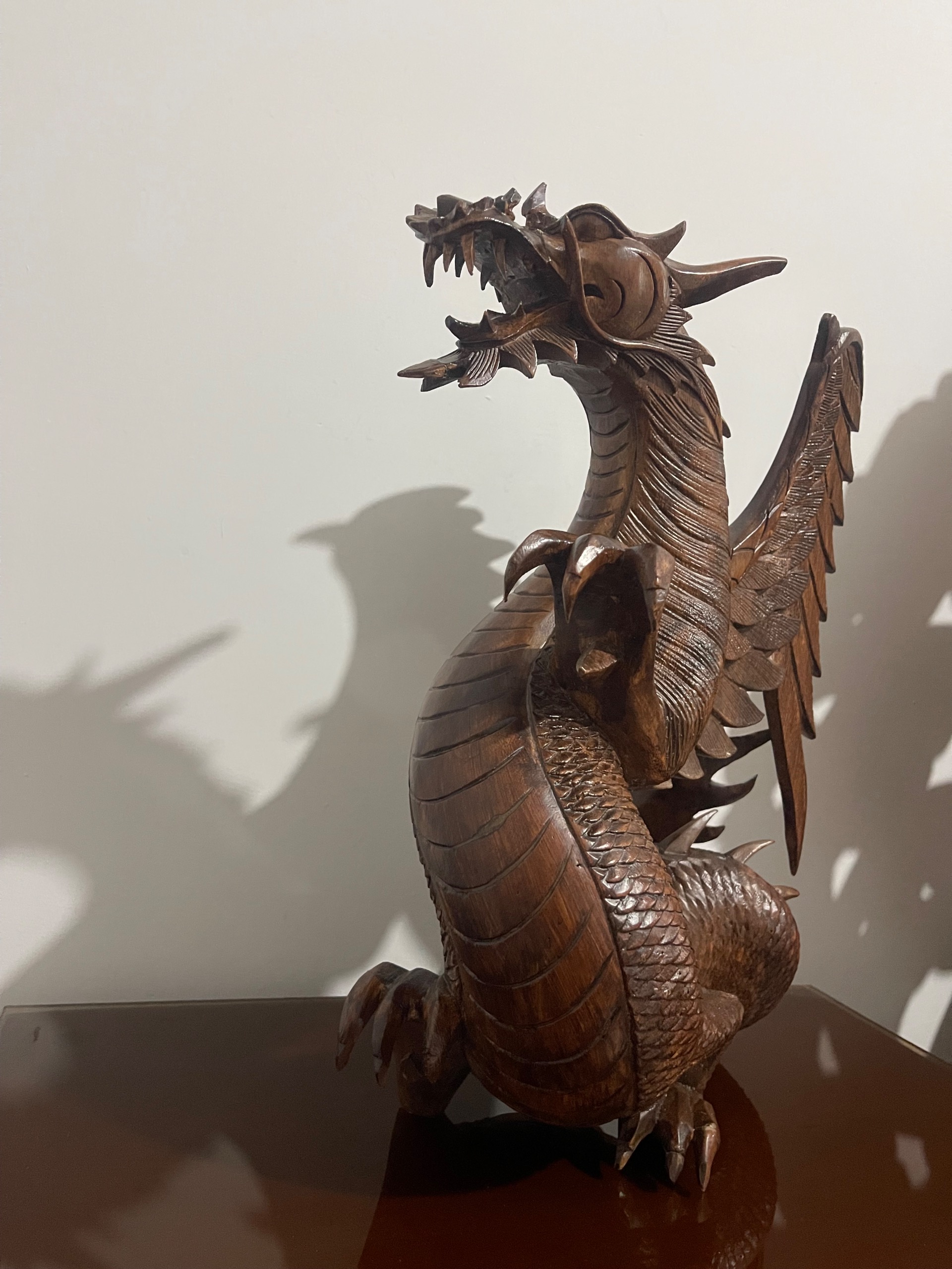 مجسمه اژدهای چوبی با حس و حال آسیای شرقی. این مجسمه دست ساز اندونزیه و بسیار چشم نواز هست. مناسب کلکسیونرها و رستوران های چینی ژاپنی