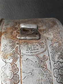 کیفیت مطابق تصویر .جنس فلز روی یا الومینیوم سبک وزن .بدون درب .با نقش گل و بوته و 3 مهر روی بدنه .قطر16 و ارتفاع 8 سانت