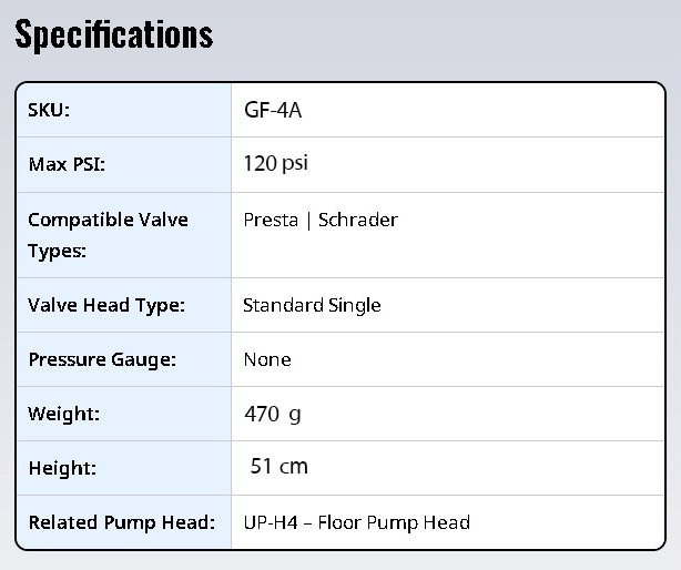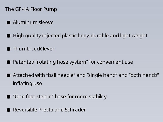 اگر به دنبال یک تلمبه مطمئن، بادوام و خوش ساخت برای استفاده روزمره یا حرفه ای هستید، مدل GF-4A انتخابی بی نظیر است. این محصول ساخت تایوان با بهره گیری از تکنولوژی روز و استانداردهای جهانی طراحی شده تا تجربه ای بی نقص از باد کردن انواع تایر، توپ، و تجهیزات ورزشی را برایتان فراهم کند.