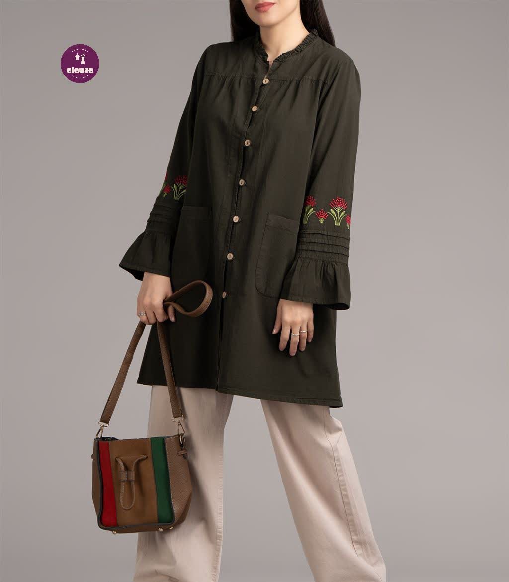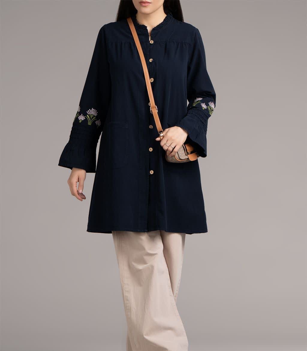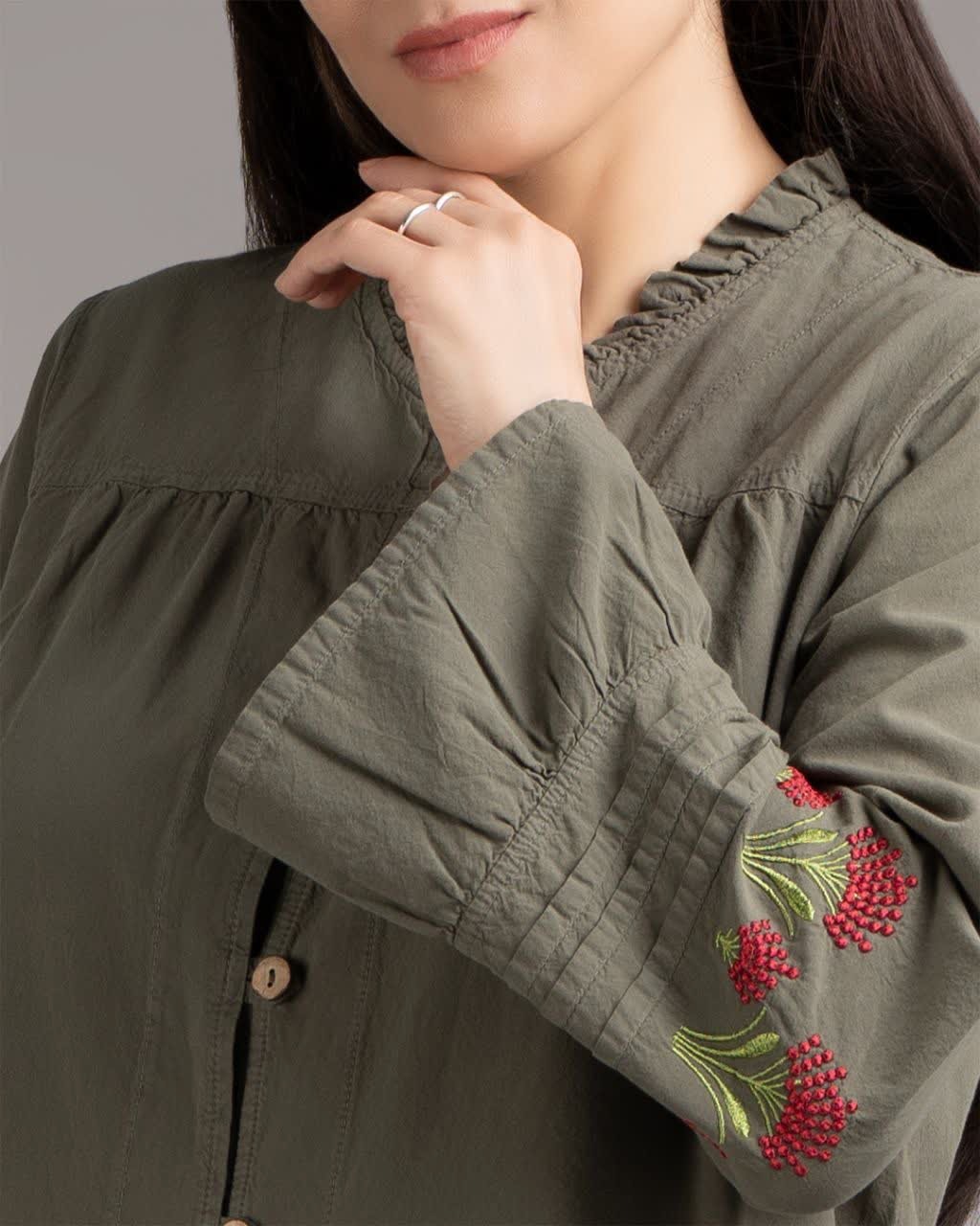 مانتو الیاف طبیعی گلدوزی شده روی آستین مدل آیلین