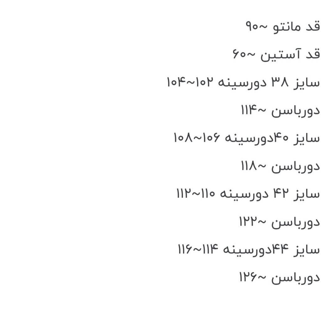 قواره کارها متفاوته. جهت اطمینان از سایز درست، حتماً عرض سینه یکی از مانتوهای خودتون رو اندازه بگیرید و ضربدر دو کنید تا دور سینه به دست بیاد، سپس با جدول راهنمای سایز در عکس آخر مقایسه کنید.