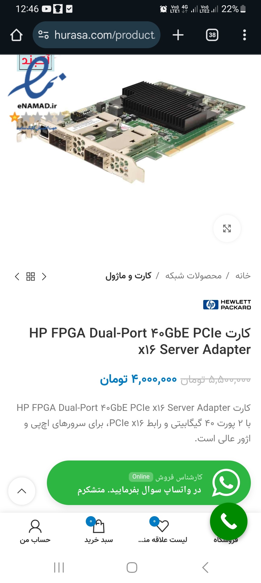 "کارت HP FPGA Dual-Port 40GbE PCIe x16 Server Adapter با 2 پورت 40 گیگابیتی"