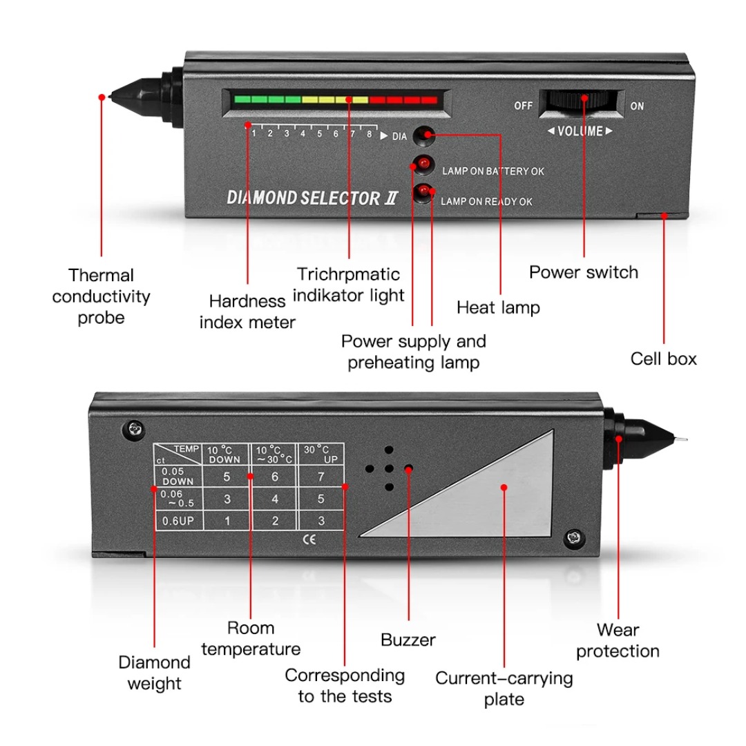 این دستگاه برای کمک به تشخیص الماس واقعی از تقلبی (مانند مویسونایت، زیرکونیا و شیشه) با اندازهگیری هدایت حرارتی سنگ طراحی شده است. الماس به دلیل هدایت حرارتی بسیار بالا، واکنش متفاوتی نسبت به سایر مواد در این تست نشان میدهد.