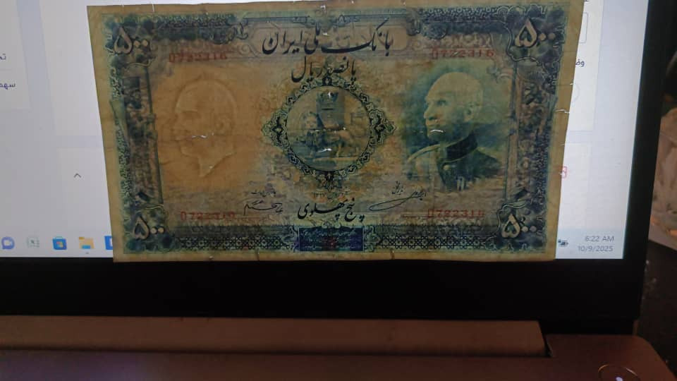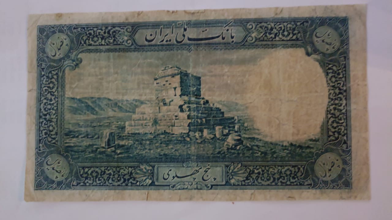 500 ، 5 پهلوی رضا شاه پهلوی شماره 57 در کتاب اسکناس کیفیت  خوب 65٪. دارای 5 سوراخ ریز 2 سوراخ متوسط و کمی پارگی سمت راست اسکناس و یک لک پشت اسکناس