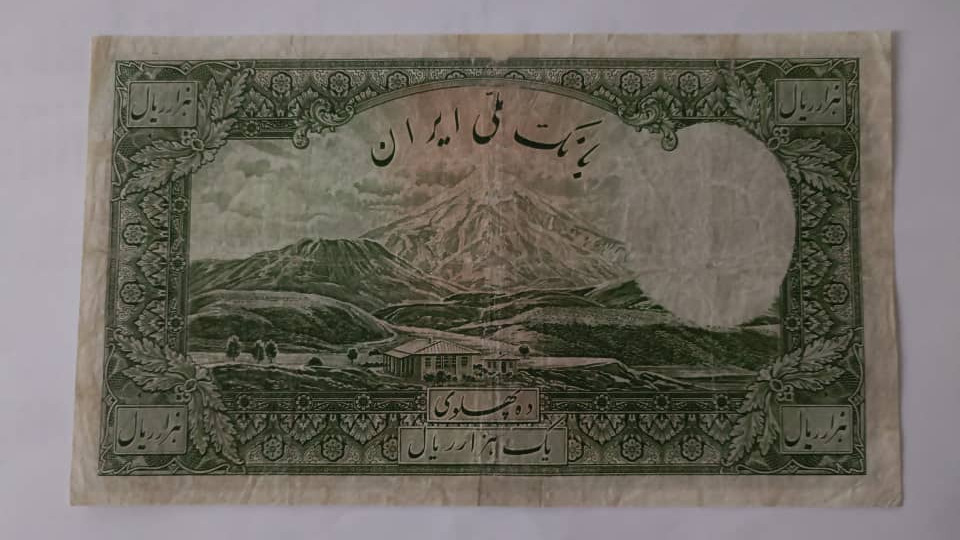 1000 ده پهلوی شماره58 در کتاب اسکناس کیفیت 65٪. دارای 5 سوراخ کوچک و یک متوسط. ترمیم جزءی بلای بانک ملی