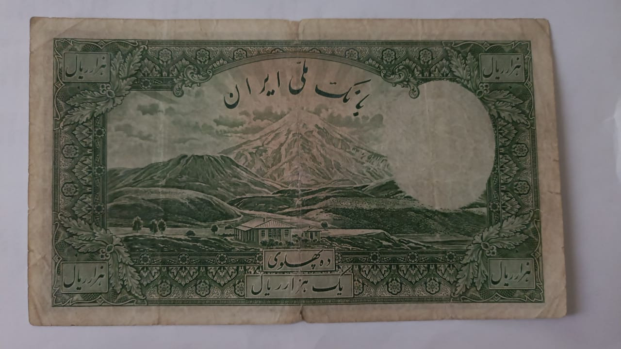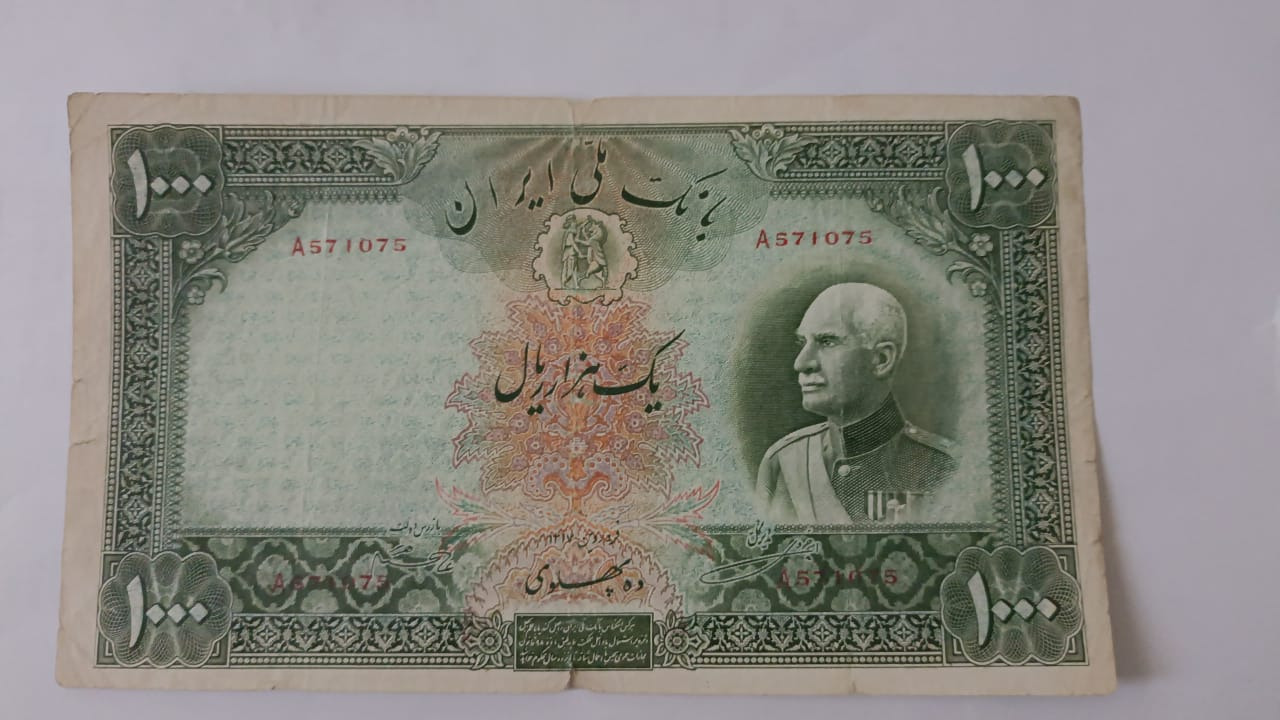 1000 ریال یا ده پهلوی رضا شاه پهلوی در کتاب اسکناس کیفیت 90%٪ در حد نو. دارای یک سوراخ سوزنی در وسط اسکناس