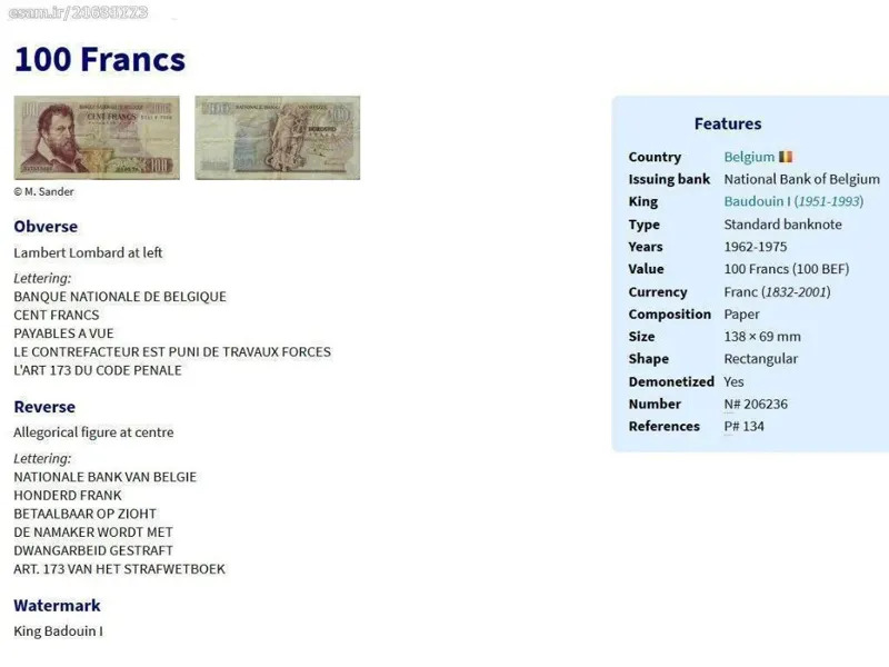 اسکناس غیر بانکی 100 فرانک بلژیک 1974 (کمیاب)
