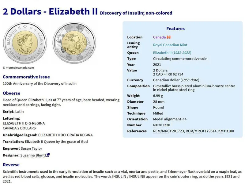 سکه یادبودی 2دلار کانادا 2021 (نایاب) کشف انسولین