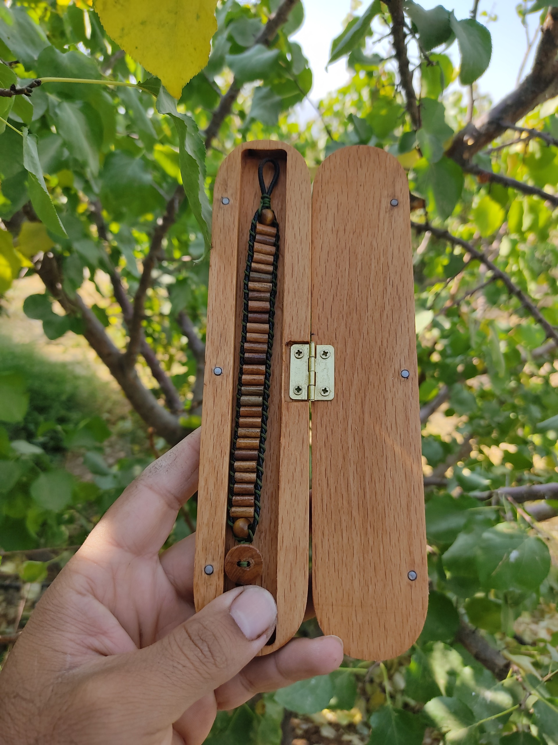 مهره های این دستبند از چوب پسته وحشی و جعبه از چوب راش درجه یک ساخته شده است. جهت سفارش باید اندازه دور مچ فرد مشخص و به بنده اعلام بشه...در ضمن مدل مردانه هم قابل سفارش و اجراست. همچنین نوع چوب مورد استفاده توسط مشتری محترم قابل انتخاب است.