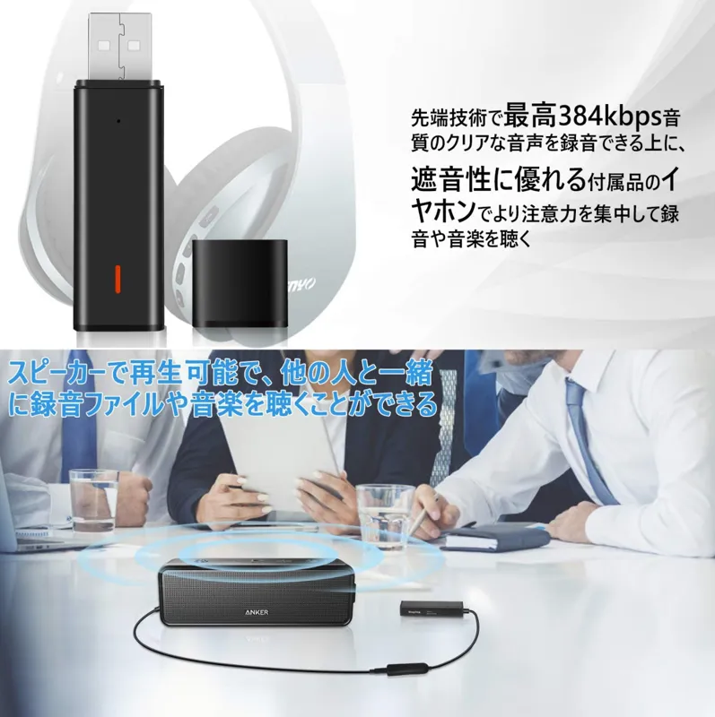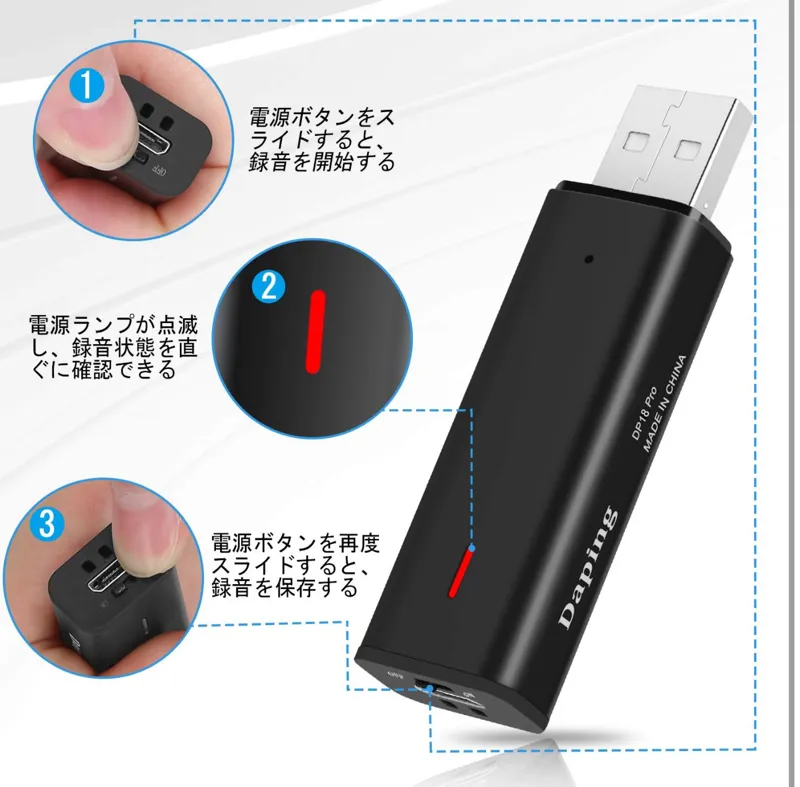 ضبطکننده از نوع حافظه USB) از نوع USB به عنوان ضبطکننده صدا استفاده میکند، بنابراین میتواند نه تنها برای ضبط، بلکه به عنوان حافظه USB نیز مورد استفاده قرار گیرد. اندازه: 2.6 x 0.7 x 0.5 اینچ (6.5 x 1.8 x 1.2 سانتیمتر) و فوقالعاده سبک (0.7 اونس (20