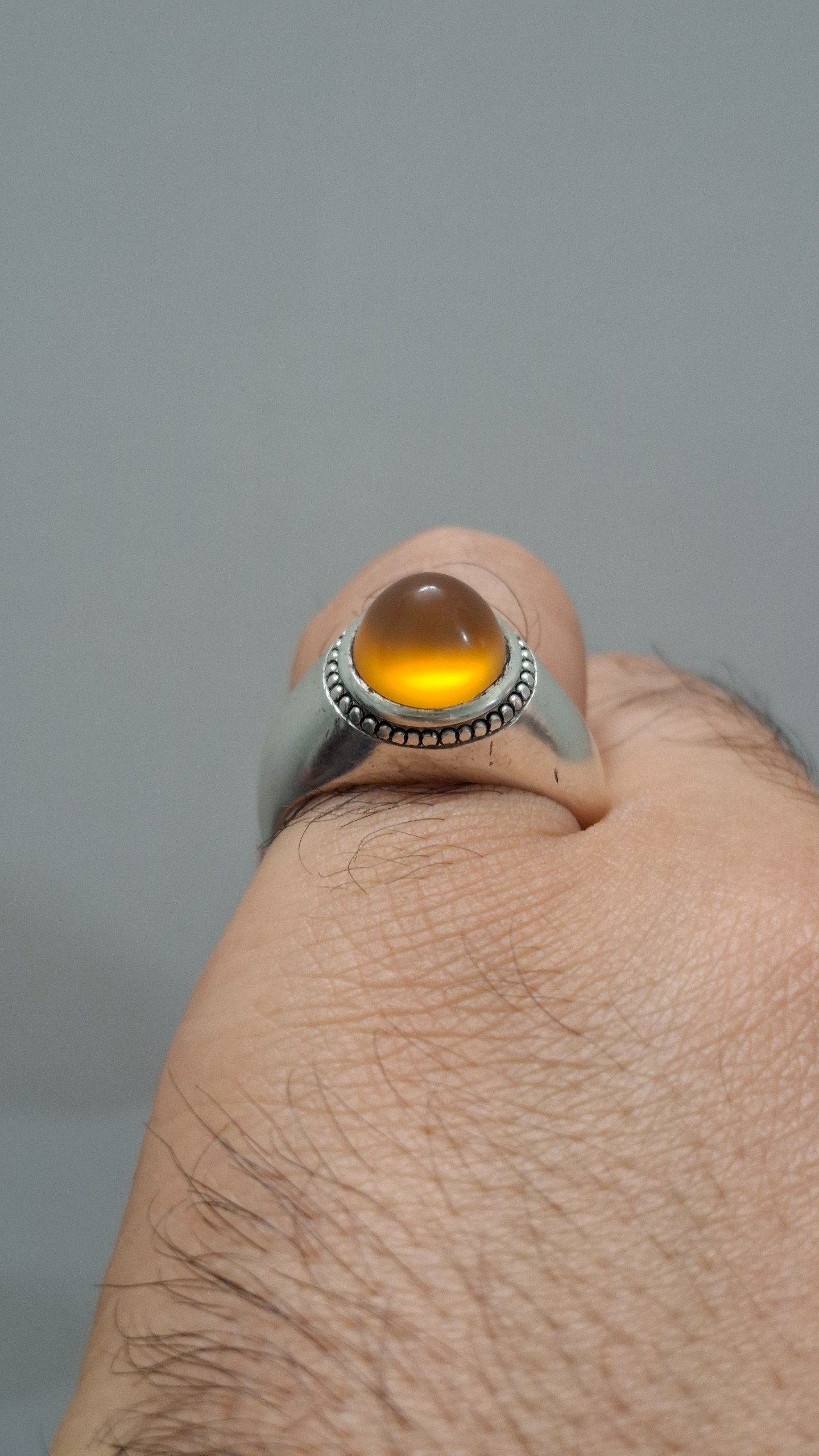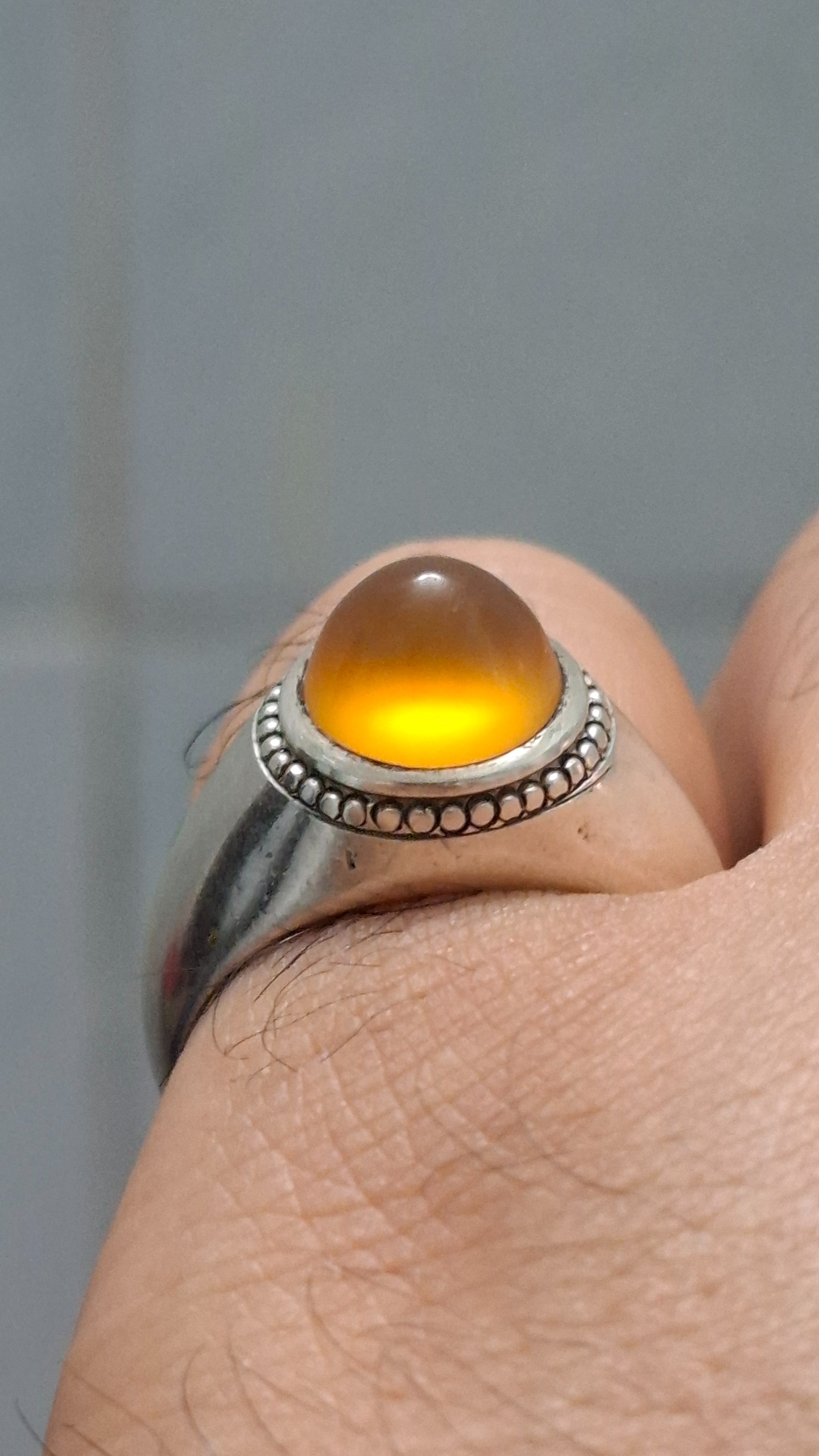 عقیق زرد کهنه یمنی کلاه دار چهار کله تیغ آبدار رکاب دستساز فیلی قدیمی بدون مهر سایز 57 .58 وزن 9.42