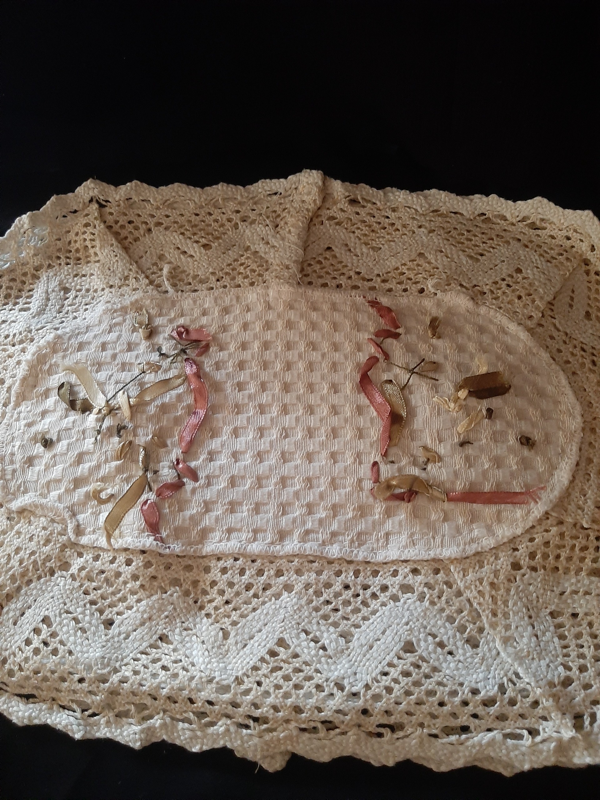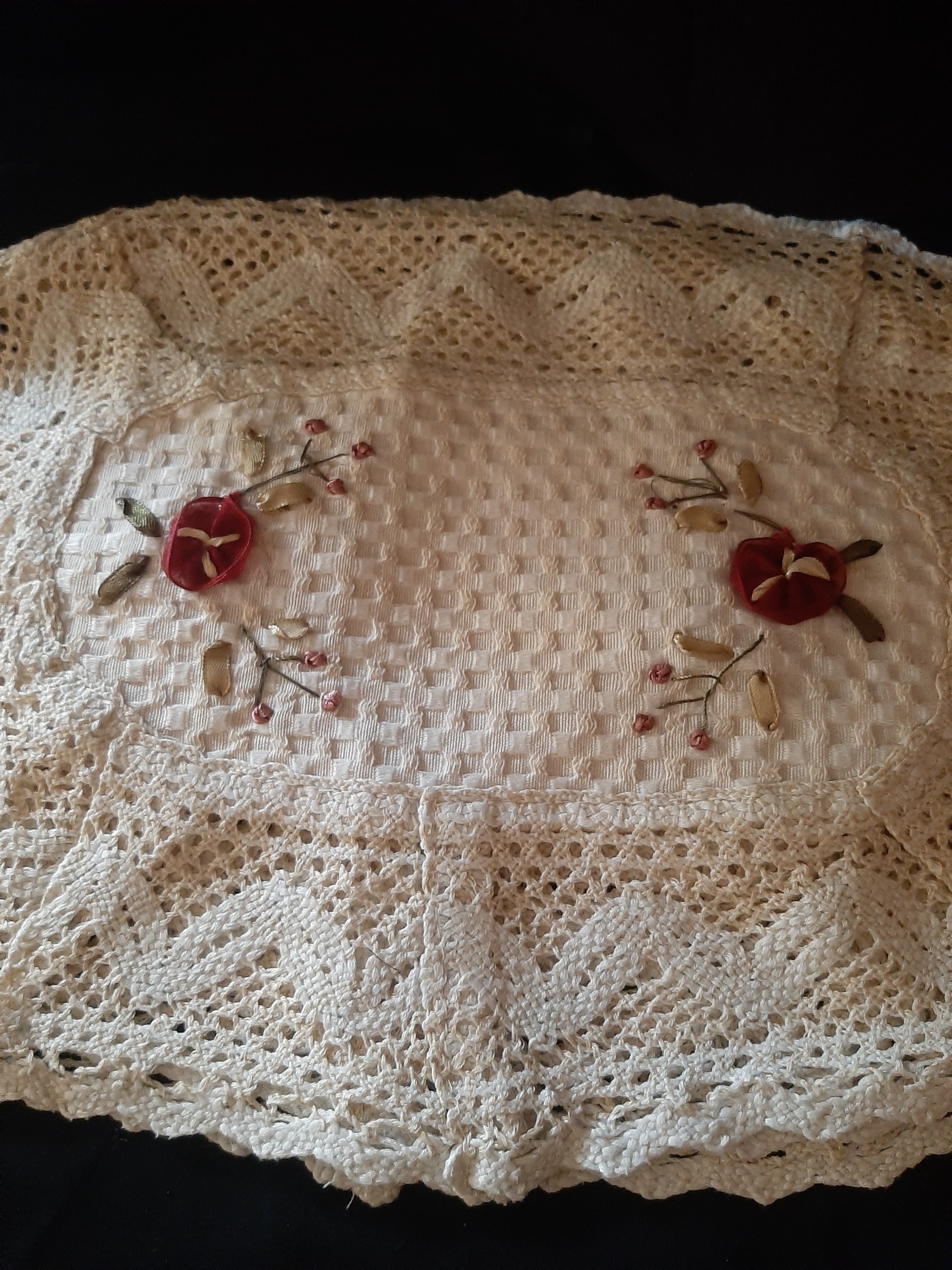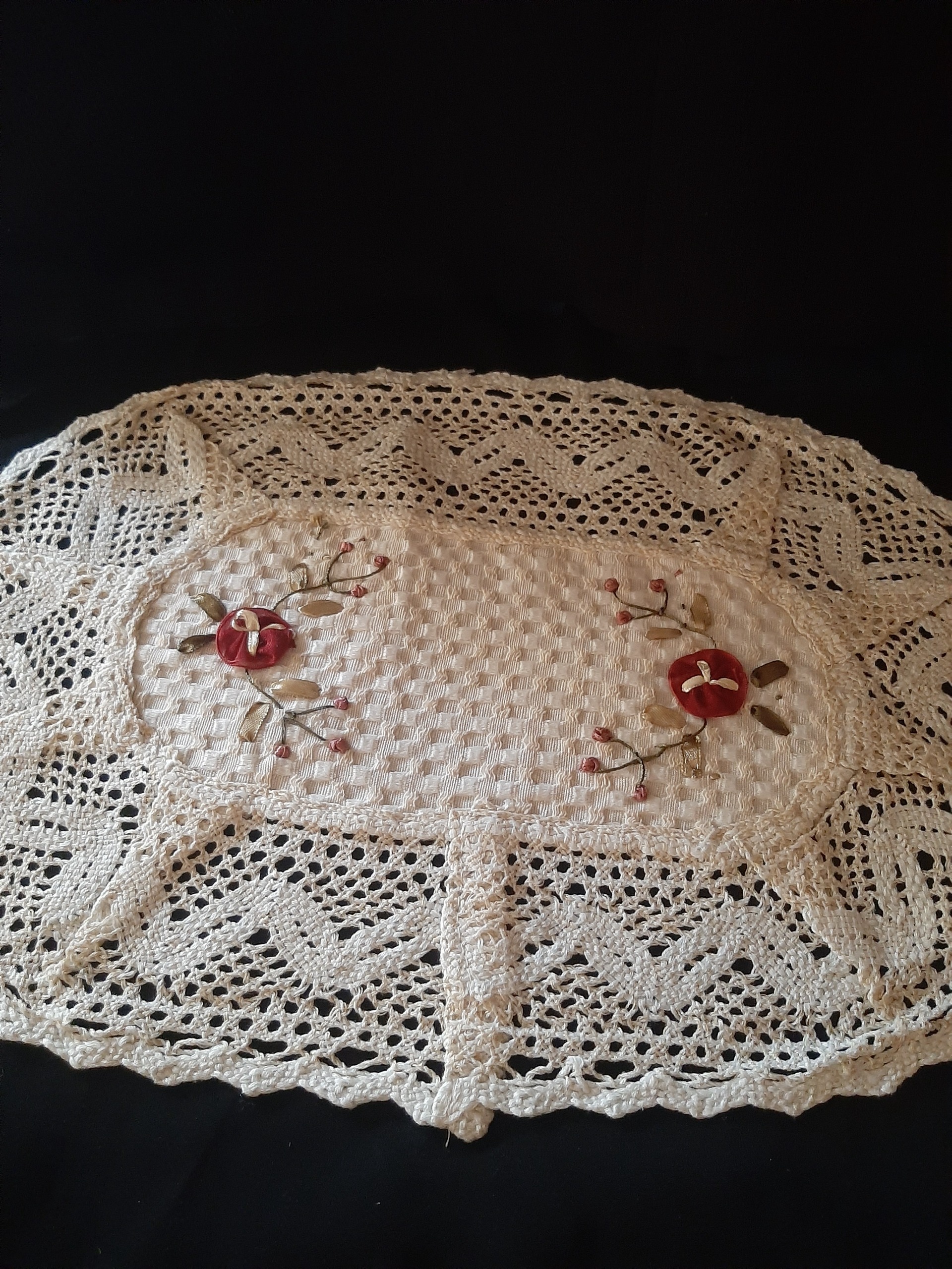 چهار عدد رومیزی عسلی بیضی کار پارچه و قلاب بافی و ربان دوزی کرم استفاده نشده ابعاد 27 در 40 سانت جهت روی میز عسلی و بوفه بزرگ دانه ای 100 بدون ارسال همه با هم 400 با ارسال رایگان