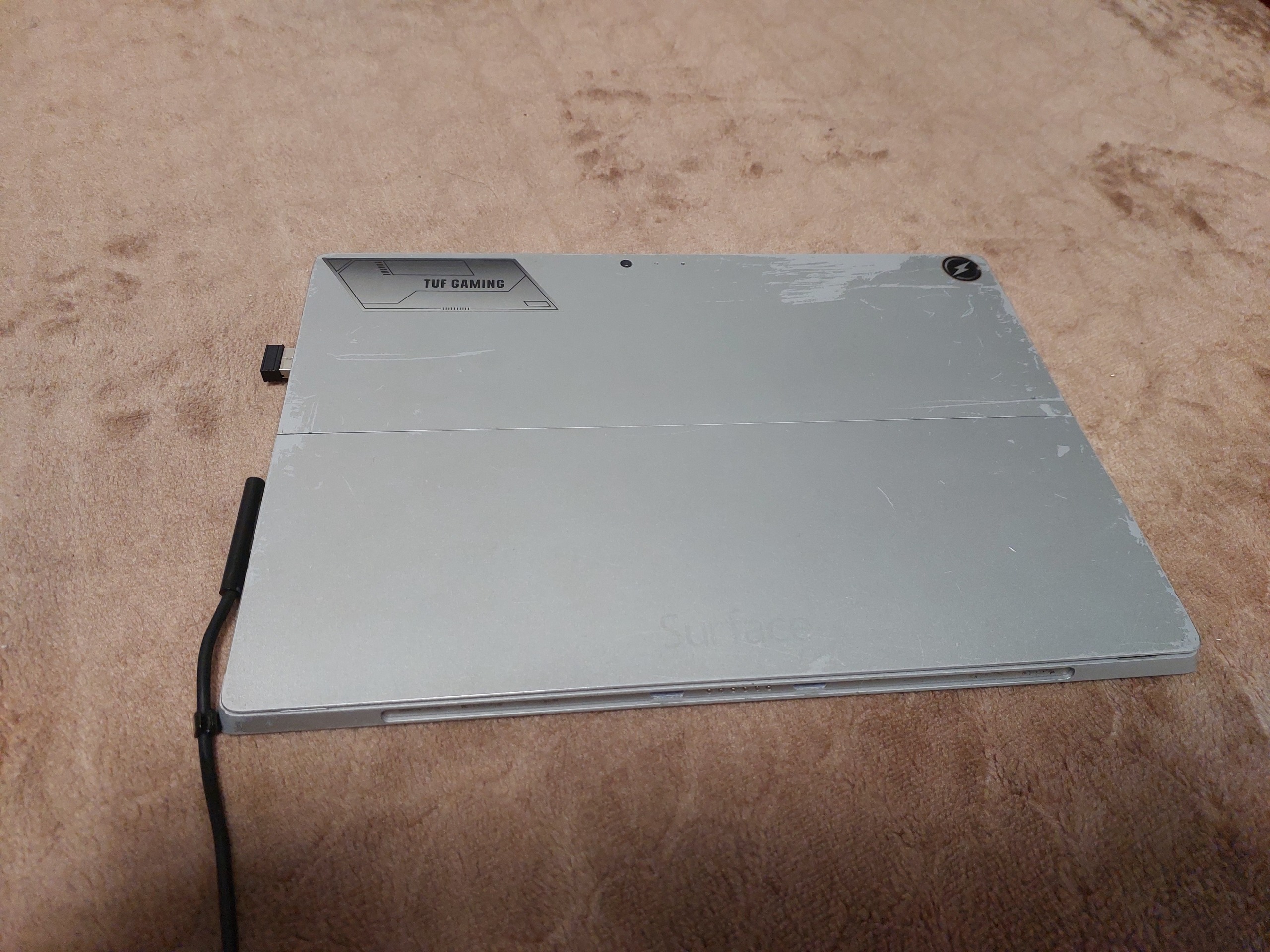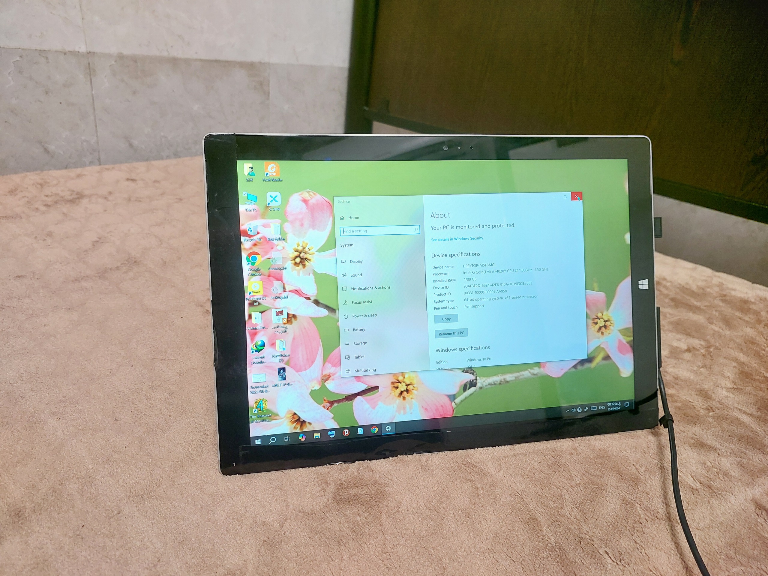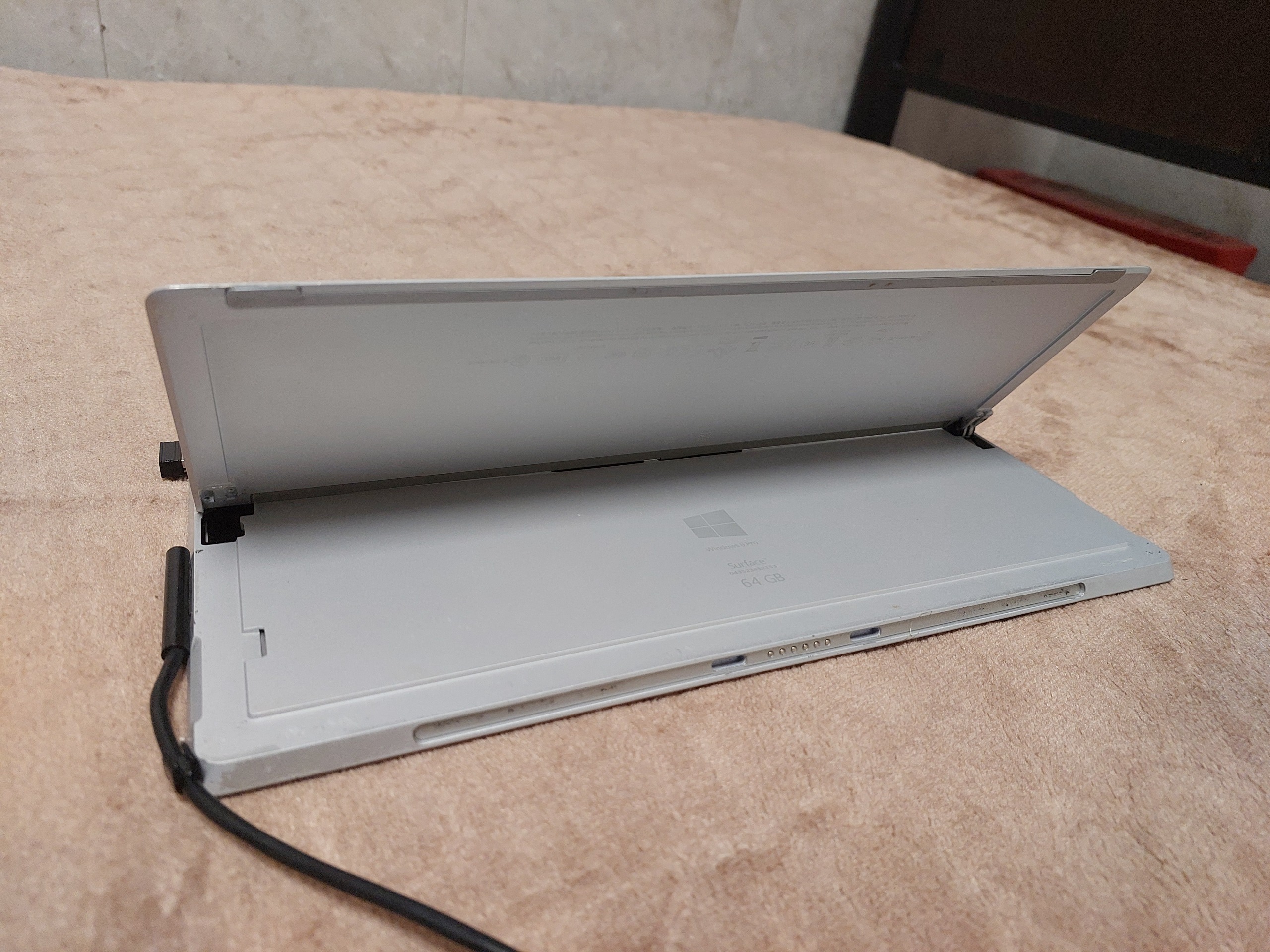 سرفیس پرو 3 تاچ ترک داره کار نمیکنه و یکی از لولاها موجود نیست ولی مشکلی نداره و راحت روی یک لولا می ایسته دور صفحه چون شکستگی داشت نوار مشکی زدم برای زیبایی