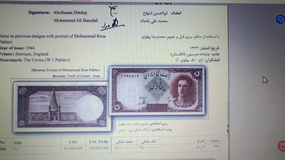 5 محمدرضا پهلوی شماره 90 در کتاب اسکناس کیفیت عالی 100% نو بانکی