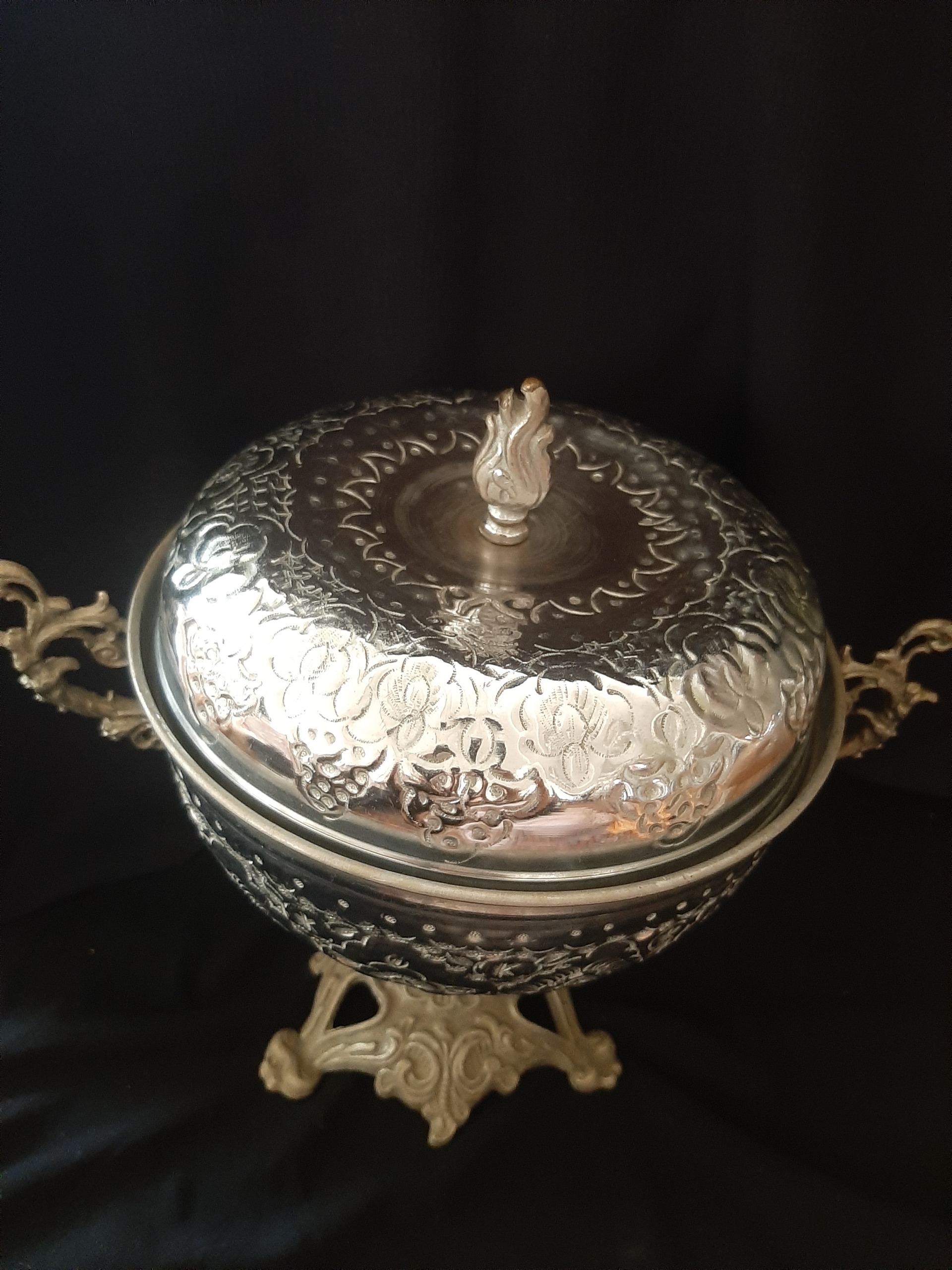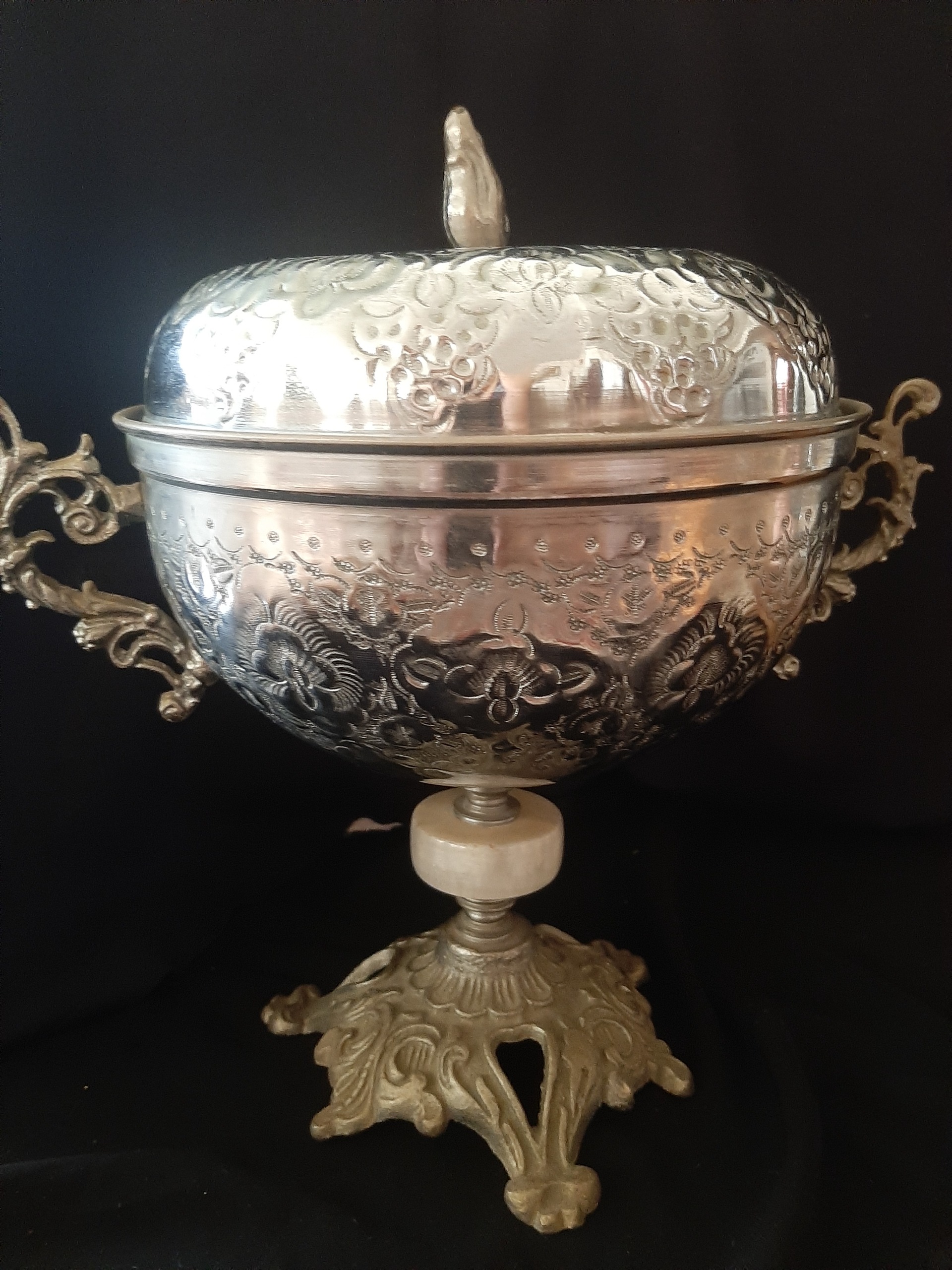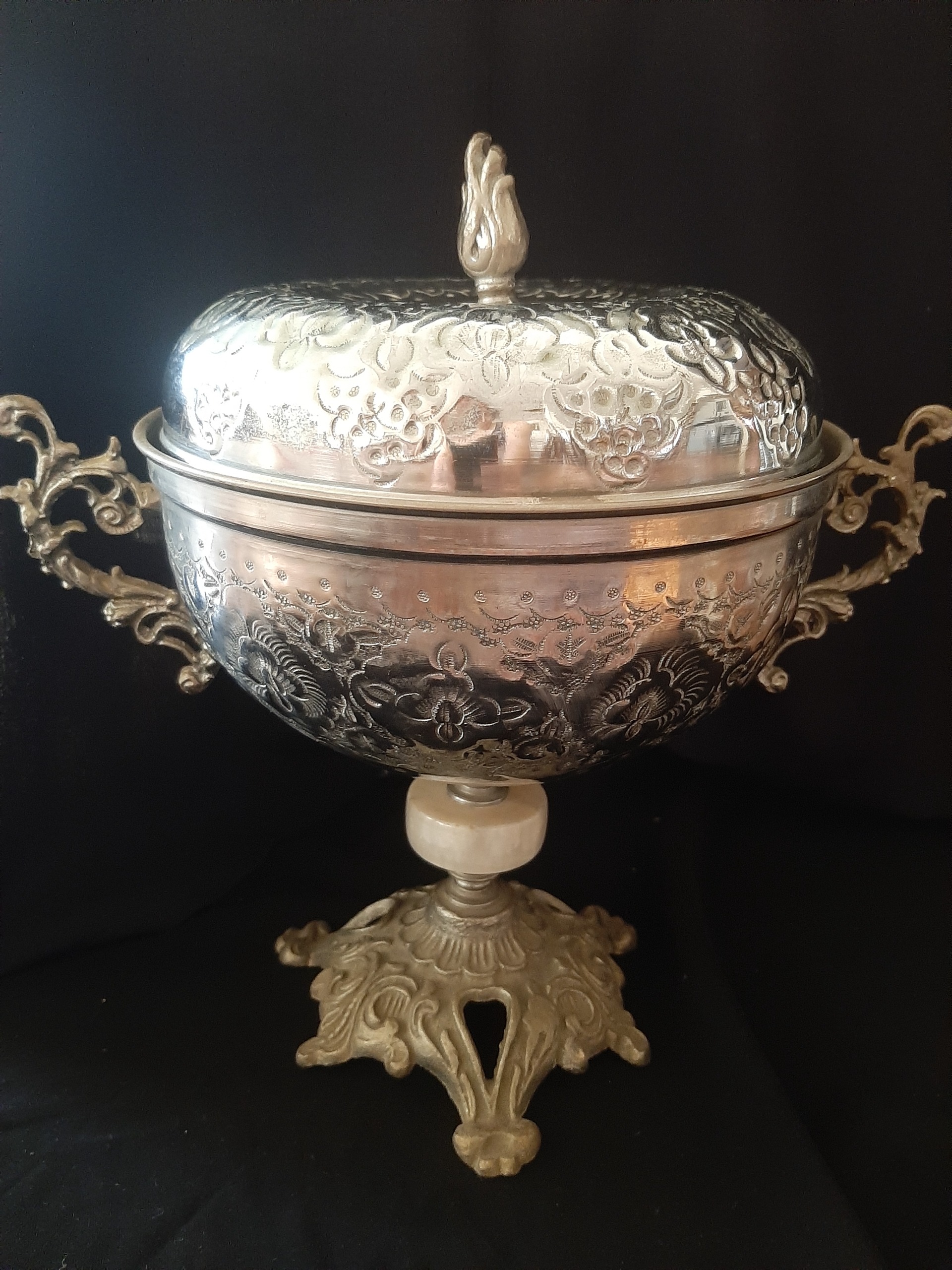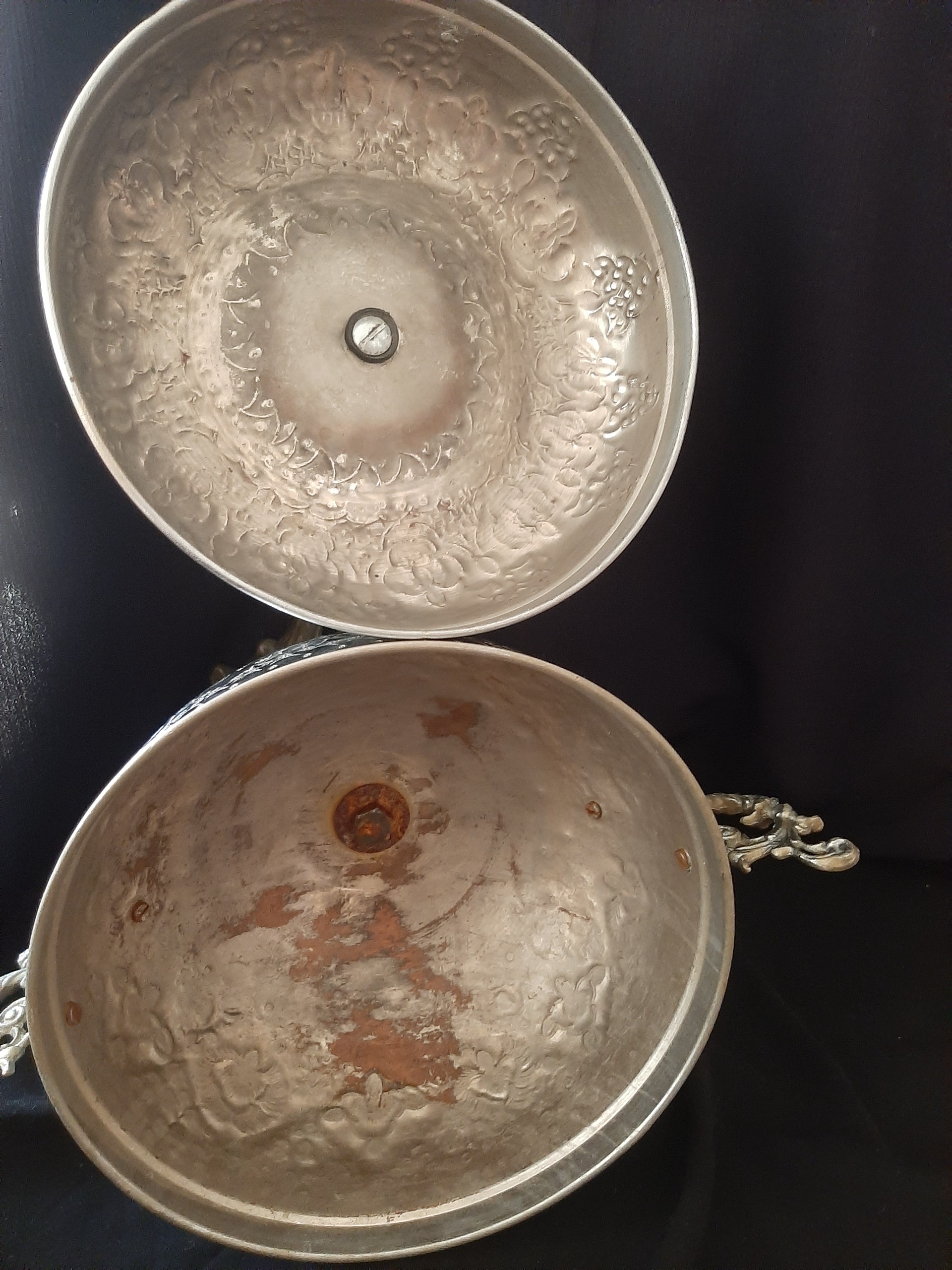 یک عدد ظرف آجیل خوری در دار پایه دار سنگ پیچ و پایه شاید برنج چون بیشتر به رنگ نقره ایی نزدیک است دقیقا مطابق عکس کهنه و قدیمی پایه ها و دسته ها رنگ نقره ایی طور دارن من از جنس شک دارم ولی عمر 80 ساله داره داخلش لعاب خود رو از دست داده اند و رنگ مثل مس نمایان شده بسیار قدیمی درخشندگی در عکس بیشتر است نیاز به پولیش دارد کلکسیونی